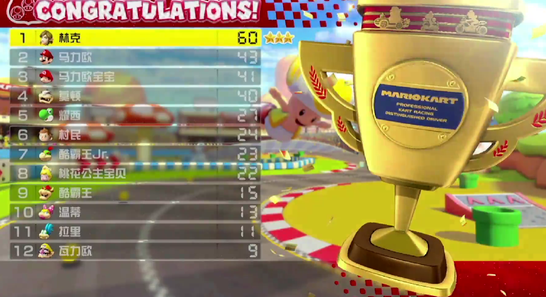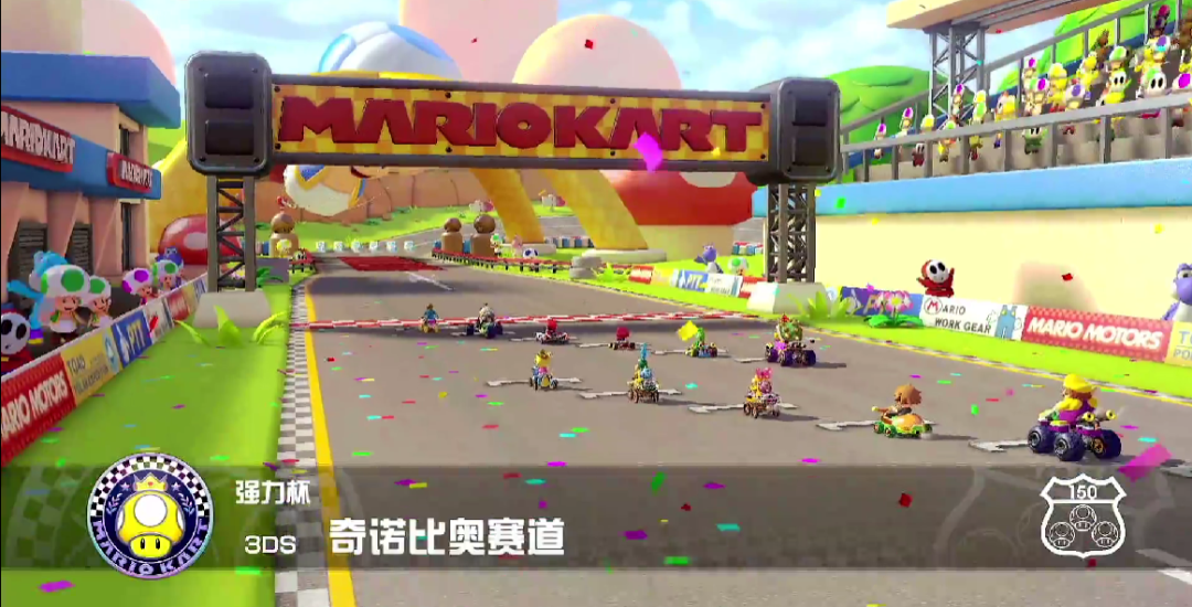 这是一条8字形赛道,有倾斜路面,主要是在巨大奇诺比奥的俯视下进行比赛,要多多使用漂移技术。