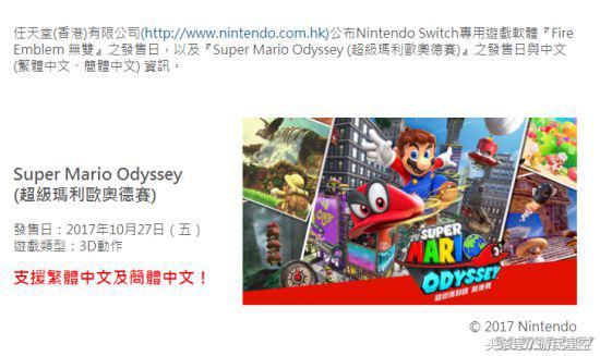 根据香港任天堂官方网站消息,《超级马里奥:奥德赛》支持简体中文/繁体中文!游戏将于2017年10月27日发售。