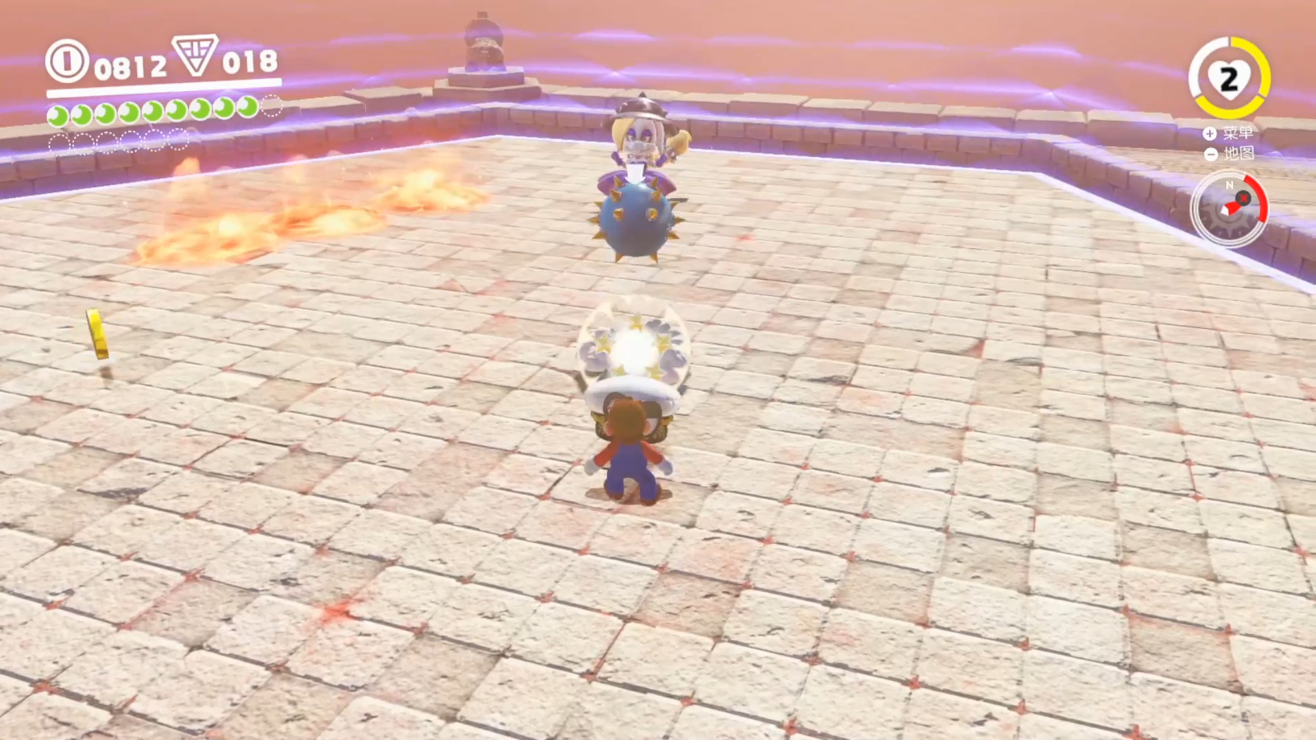 当小紫投掷了三次炸弹后就会解除二阶段,这个时候有个小技巧,用凯皮攻击小紫飞碟正下方的炸弹,就能把炸弹弹上去攻击小紫,强行结束二阶段