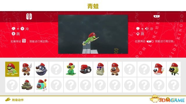 本作除了历代马里奥的核心玩法之外,玩家在通关或自由探索时总会不可避免用到的就是“帽子附身”这一新技能。马里奥和他的新伙伴Cappy可以附身在许多关卡中出现的其他生物或是非生物身上,从而操控该物体并允许使用能够帮助通过关卡的特殊能力。虽说相比马里奥系列前作都多少含有一些变身成分,但这次的帽子附身机制可以将可以说是极大地拓展了平台动作类游戏的玩法。