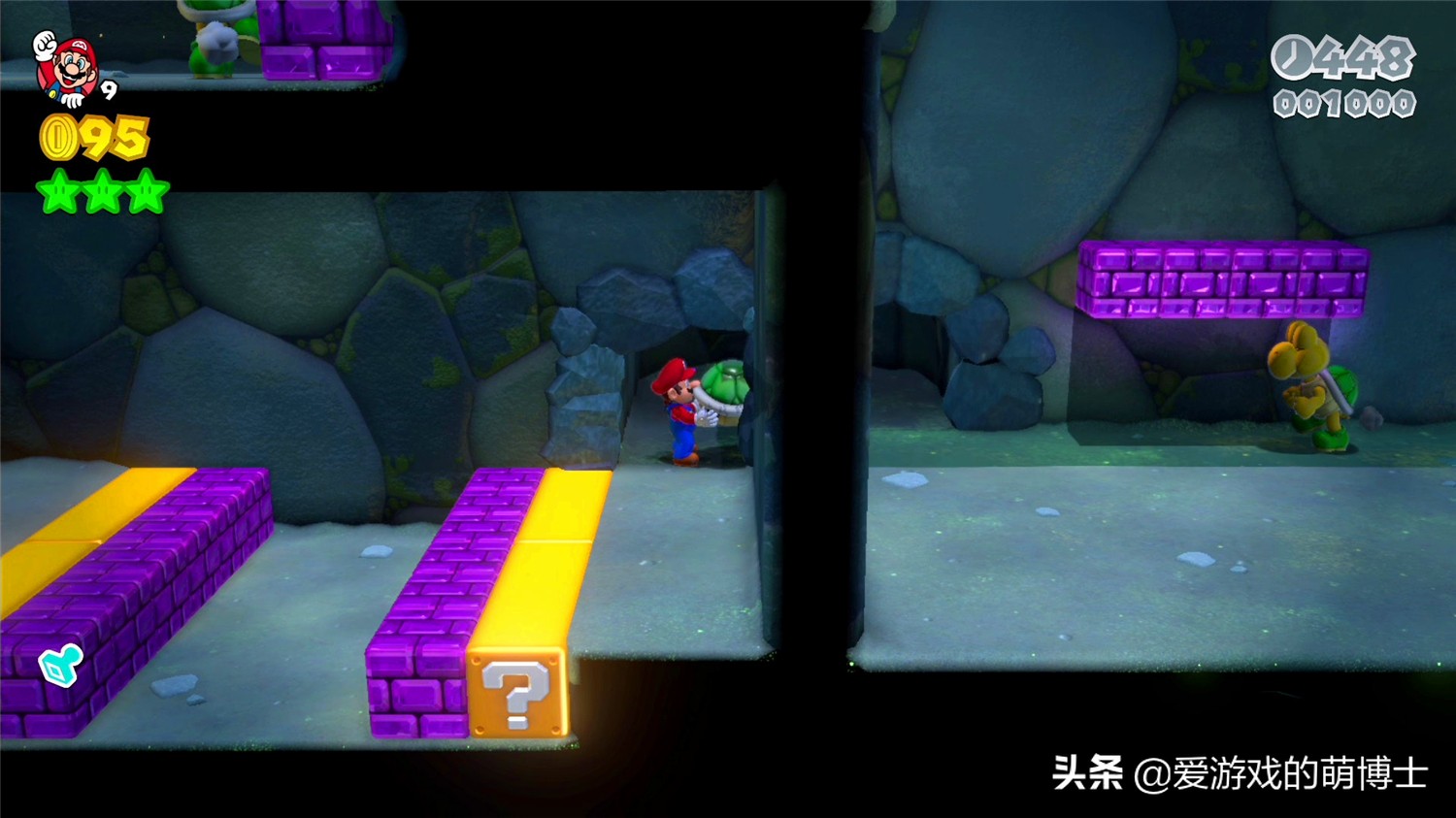 如果家里的小朋友不太擅长动作游戏,老是挂掉影响游戏体验的话,博士这里告诉大家一个“无限生命”的小秘籍。我们在游戏中调出选单界面,进入“资料”,选择一个特定的存档。当然,这个存档需要玩到“World 1-2”。在这个关卡进入水管然后会发现左方的小洞,这里有一只乌龟。我们拿到龟壳后,让角色在洞口面对墙壁,按“X/Y”投掷龟壳的同时跳起,成功操作后可以踩到龟壳,角色会进入“不停弹跳”的状态。