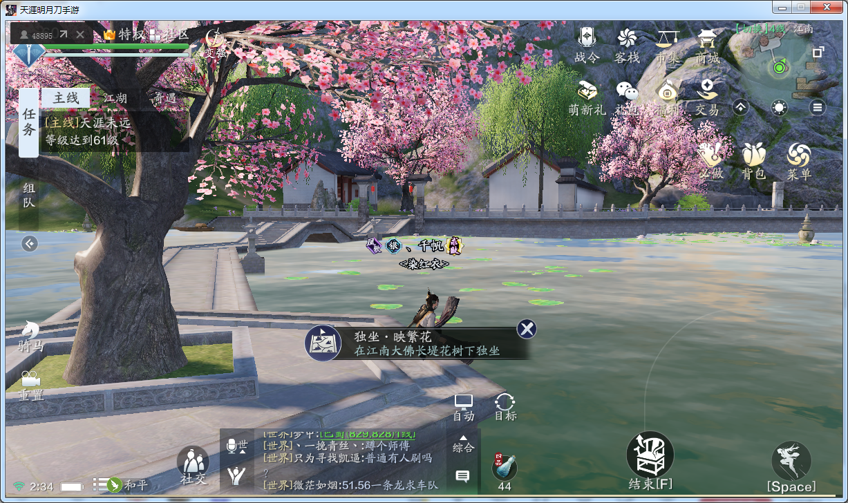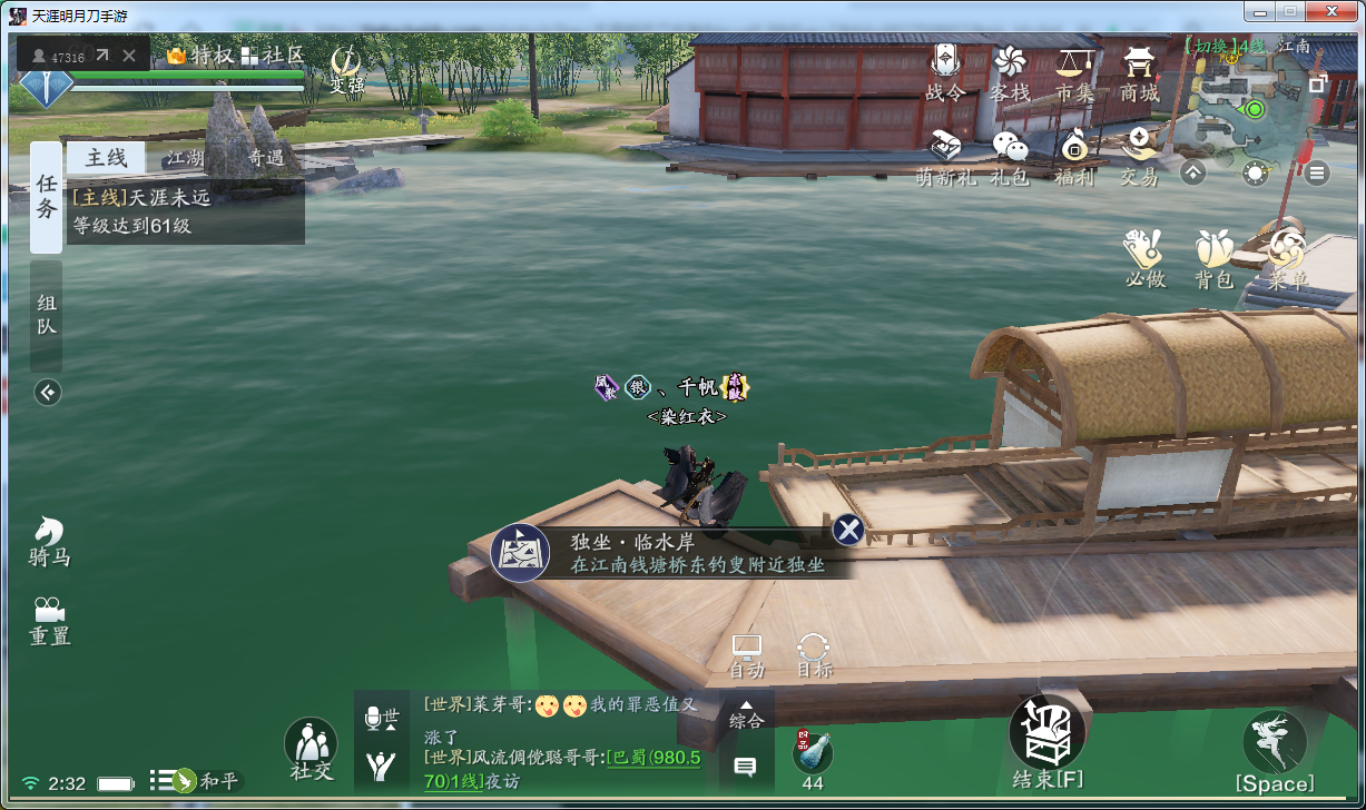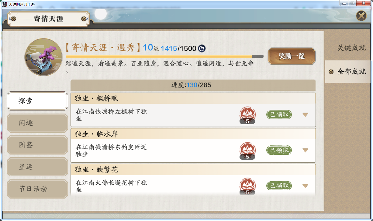寄情天涯成就里,有个探索成就,这里除了天气成就需要在特定时间等待之外,其余几个惊鱼成就和独坐成就是可以随时单独完成的
