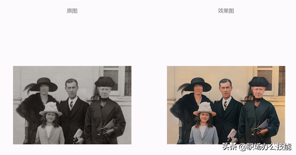 修复前后效果对比图,同时还可以对黑白照片进行上色,非常有意思!