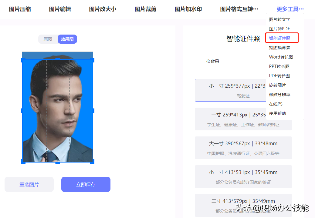 智能证件照:证件照在线制作功能能够在线修改证件照的背景及尺寸,并且提供了小一寸、一寸、大一寸、小二寸、二寸证件照的模板,方便快速制作蓝底证件照、结婚证件照等各种证件照。