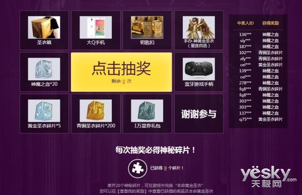 5月13日全新版本【天界篇の灭世神罚】公测后,全民海量奖励送不停,注册、登录、升级在线、整点抢宝,活跃度均有大礼赠送。本命黄金圣衣,黄金之血,神魔之血,时装,坐骑,橙色星魂,守护星等,海量奖品,让你拿到手软!