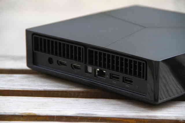 主机前面板部分设有两个USB 3.0接口、外星人Logo设计的背光电源开关以及经典的Alien FX三角形灯。而在机身背面则集成了大部分接口,包括电源接口,HDMI接口,光纤输出接口,以太网网线接口,双USB 3.0接口,还有大面积的主机散热排风口,整体主机的设计十分紧凑且简洁。