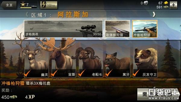 总的来说任务不复杂有可玩性,每个部分都有步枪挑战、散弹枪狩猎、冲锋枪狩猎3个任务区以及5个Boss动物(枪支达到规定属性即可挑战下一关)。玩家按照给的提示(射击动物各个部位)完成任务,前期照任务走就行,体力和狩猎币是完全足够的。命中心脏额外奖励10狩猎币,做完4个左右任务就攒足1000+狩猎币买枪了,狩猎币买的都是新手级枪支(当然土豪的大腿一定是粗的~要用就用好的),往后会有任务要求,一定要看清楚要求不然体力就浪费了。系统内给的是10点体力,用完需要金条购买或者等待冷却时间。商城里有免费金条获取选项,每天可观看4个视频每个给3个金条。枪支的改造也是一个亮点,不同的枪改法不同最终体现的威力就大不相同,可以让玩家自由改造,打造属于你独有的猎枪。