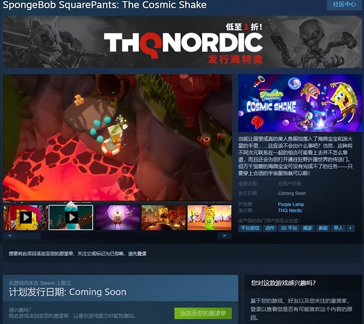 在上周的THQ 2022游戏展示会上,官方公布了《海绵宝宝》IP新作——《海绵宝宝:震撼宇宙(SpongeBob SquarePants:The Cosmic Shake)》。目前游戏已上架Steam商店,但页面信息寥寥,仅显示支持简中字幕、界面,以及PC配置推荐内存16 GB RAM。