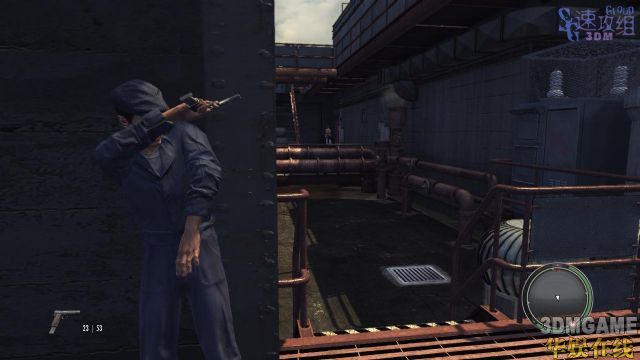 干掉这里两个人上楼梯就会有人拿汤姆森了,杀掉后捡枪,杀到屋顶的另一端去。另一端这里的起降机,使用后会上来个人,不过太很幸运,只是被我们绑了,没杀掉。绑好了后做升降机下去。到了会议室的窗外后抄家伙,刷窗户。CG动画,房间里的炸弹提前爆炸了,没有炸死目标人物。CG结束后一路从会议室杀到一开始来的停车场。