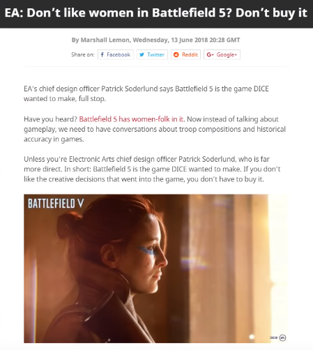 这一言论直接让很多玩家认为——CA觉得你们“爱玩玩,不玩滚”。事实上,公关奇才EA在面对《战地5》的批评时,也表示过“要么接受要么就别买”。这一评论加上人们对游戏中女性角色的出现感到不满加在一起,成为了引爆差评炸弹的导火索。