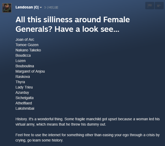 其实CA早在今年的3月8日妇女节就在更新中加入了克利奥帕特拉和乌塔为代表的女性将领,而在当时却并没有引起什么讨论,直到近日一位名为Erick的用户上传了一张图片,显示他8名可用将领中,有5位都是女性,并且批评了CA此举并不符合历史。与此同时,Steam创意工坊中甚至马上就出现了一个降低女性人物出现几率的Mod。在Steam论坛上也出现了许多关于这个问题的讨论。