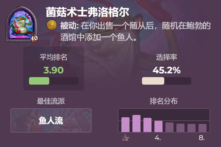 目前排名第一的英雄是菌菇术士,这点并不意外,作为后期唯一能和纳迦抗衡的鱼人流派掌门人,菌菇术士的技能甚至比女王更容易找随从,不强没道理。建议各位刷到菌菇术士的小伙伴果断选下,吃烂分是轻轻松松。除了菌菇术士,T1行列还有一位苔丝小姐姐,这也很合理,毕竟目前每局都有大量纳迦流玩家,苔丝小姐姐可以轻松靠技能拿到纳迦核心或者凑三连,后期内战更是无敌。