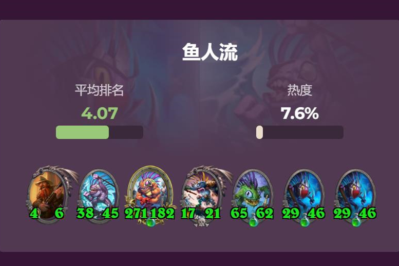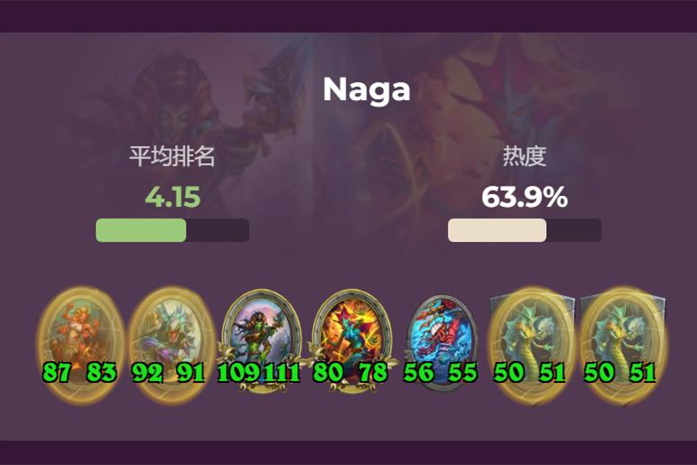 目前,老牌的强势流派基本都被纳迦打崩了,打没了。比如龙族直接从万年不变的第一名直接到了倒数第二,失去融合巨怪的元素变成了全员傻大个直接垫底。唯一能和纳迦碰一碰的老流派就只剩下了我之前预测的鱼人。依靠新核心小瞎眼和铜须的组合,鱼人每回合的成长量完全不逊于纳迦,且剧毒配合远超纳迦的血量,在大后期会比纳迦更强。