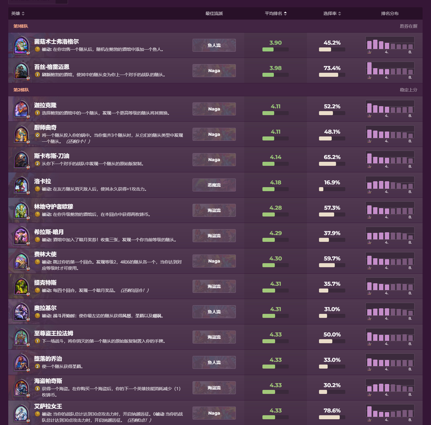 炉石传说23.2补丁更新后,由于海量新内容的加入,HSR的酒馆战棋数据一直没有更新,大家是不是都等不及想要知道酒馆战棋新英雄艾萨拉女王和纳迦体系的强度了呢?本文就来送上HSR最新的酒馆战棋数据。PS:由于新赛季分数重置,分段差异不大,直接看所有人的数据咯~