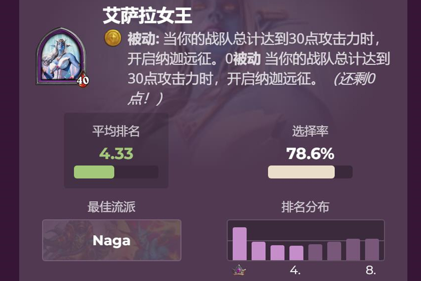 酒馆战棋当前版本各个英雄的排名如上图所示(受限于篇幅仅放出部分,完整版见动态)。首先,最让我意外的是艾萨拉女王这个炉石传说设计师钦定的纳迦英雄,拥有先天的升本找怪优势,居然没有登顶,甚至只排到第15名,属实有点离谱。我自己拿到艾萨拉女王除了一局怎么都刷不出高攻击随从和塑造法术纳迦,在变身后直接速八,其它要么是吃鸡,要么也是第二,怎么会这么弱呢?谁来给我的答案?