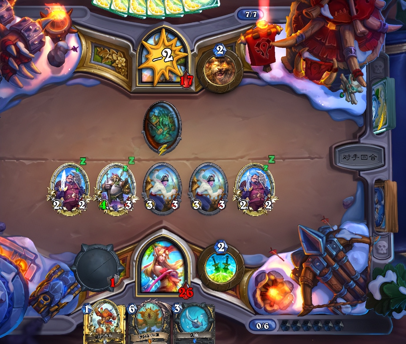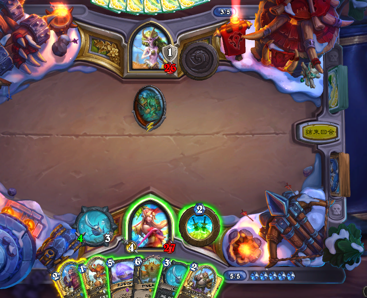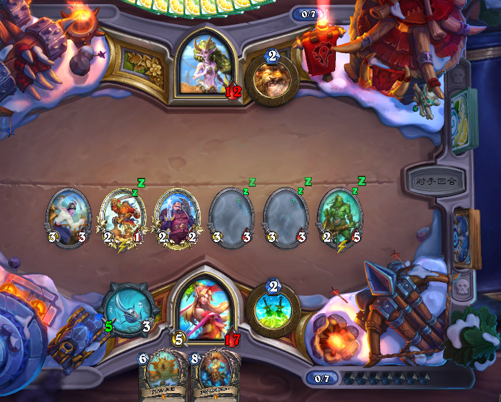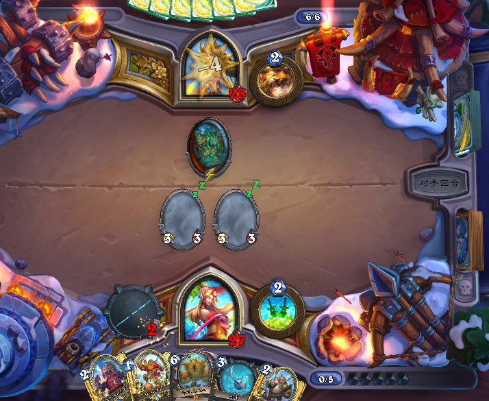 因为6费之后德鲁伊的解牌和控场手段就开始多起来了,所以我们需要尽可能通过做场来扩大优势,一旦场面成型我们就可以凭借这一场面直接压死对手,同时武器配合随从的抢血这一高节奏压制足以让小德无暇变身,只要能阻止其跳费以及变身,那我们基本上就算是拿下了。