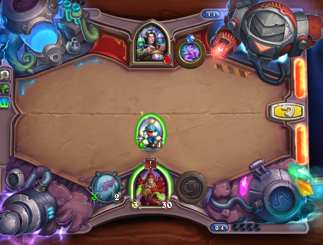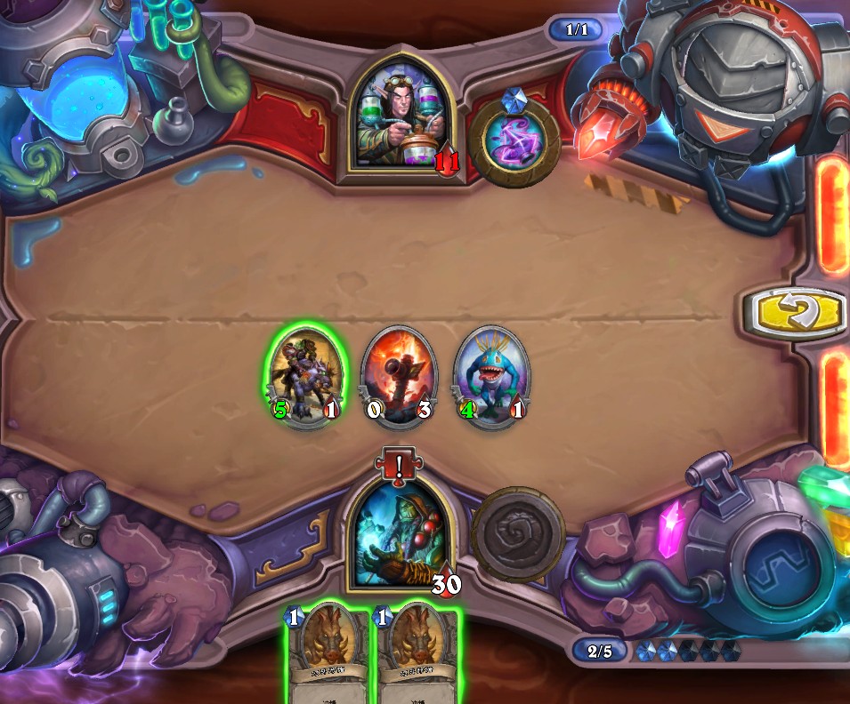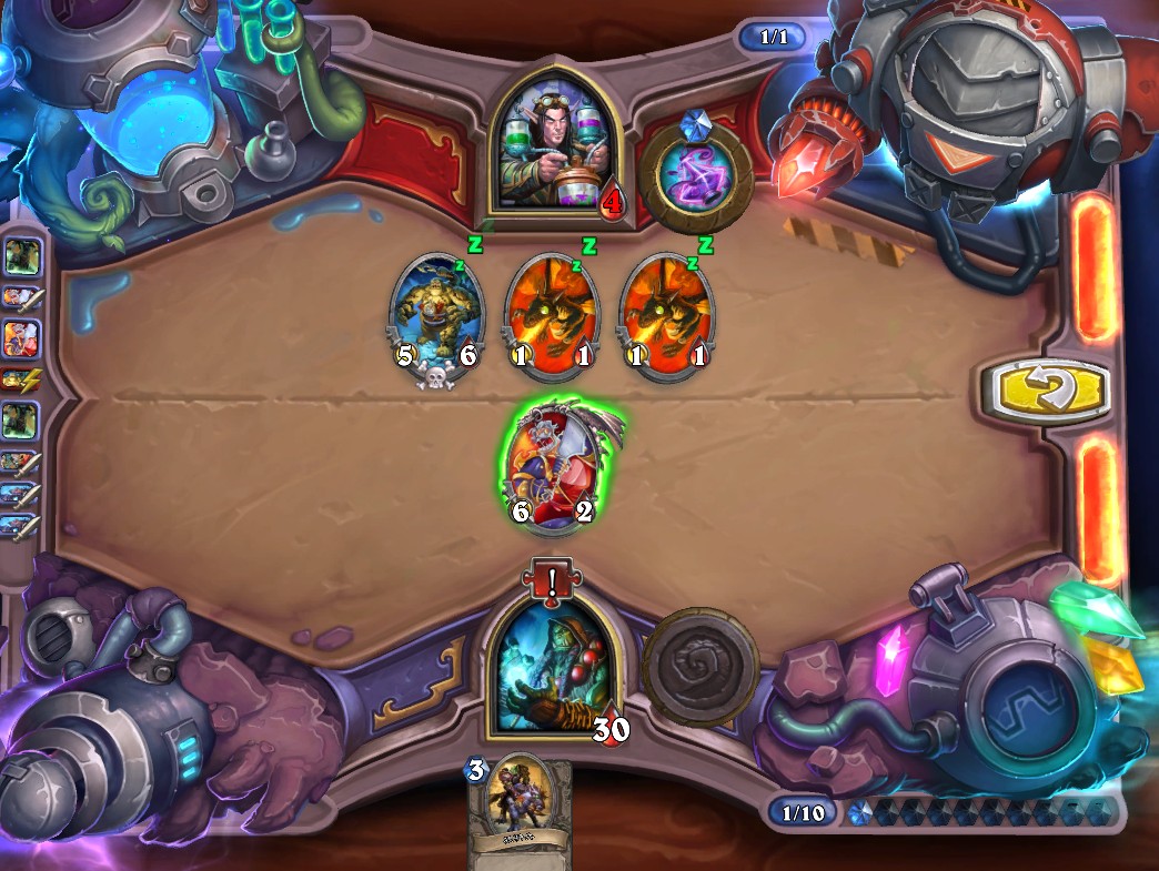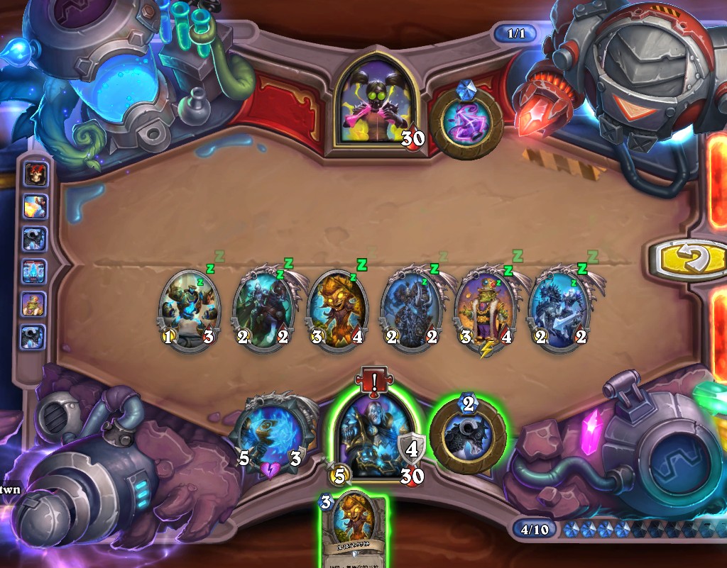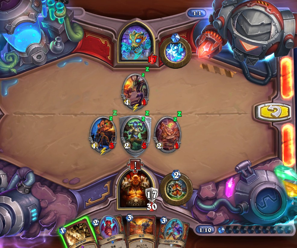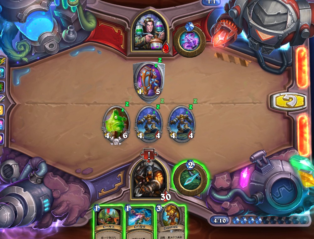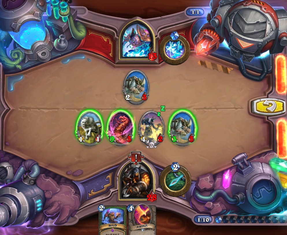 4.最左边3/1的石牙野猪解灰熊、4/1蓝腮战士解持盾卫士、手牌中所有随从以此紧邻火舌图腾打出最高伤害