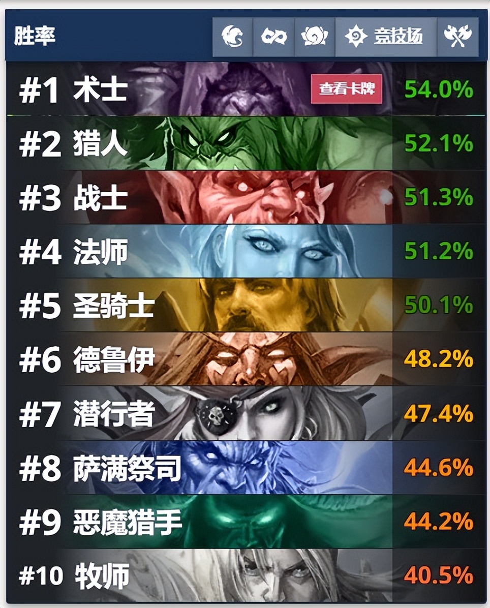 某一次竞技场补丁降低了好卡的出现概率,强卡的出现概率降低以及版本的变化,造就了胜率第一的术士。