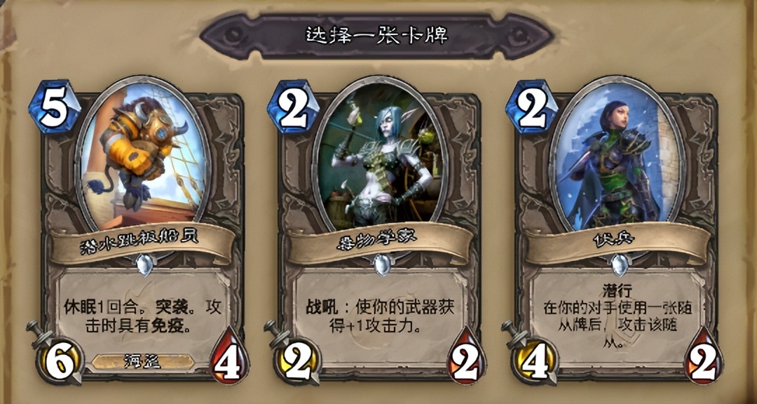 这一抓我主要安利下我在竞技场最喜欢的潜水跳板船员,这张卡需要休眠一回合才能用,本身自带突袭加攻击具有免疫,可以白嫖对面一个场面,而且休眠和直接站场其实差距并不是很大(嘲讽以及效果bug的软嘲讽随从除外),在这个主打节奏的环境中这张卡压场还是非常舒服的。