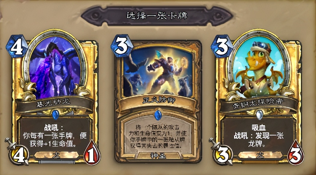 骑士之所以强势因为这次竞技场卡池有巨龙降临的卡,青铜龙探险者加强变为3/3之后绝对是抓位优选,本身不亏身材兼具吸血,同时还有发现龙牌的效果,要知道目前中立龙卡都是相当能打的,发现一张直接血赚,相比于单解正义防御,我更倾向能带来更高上限的青铜龙探险者。