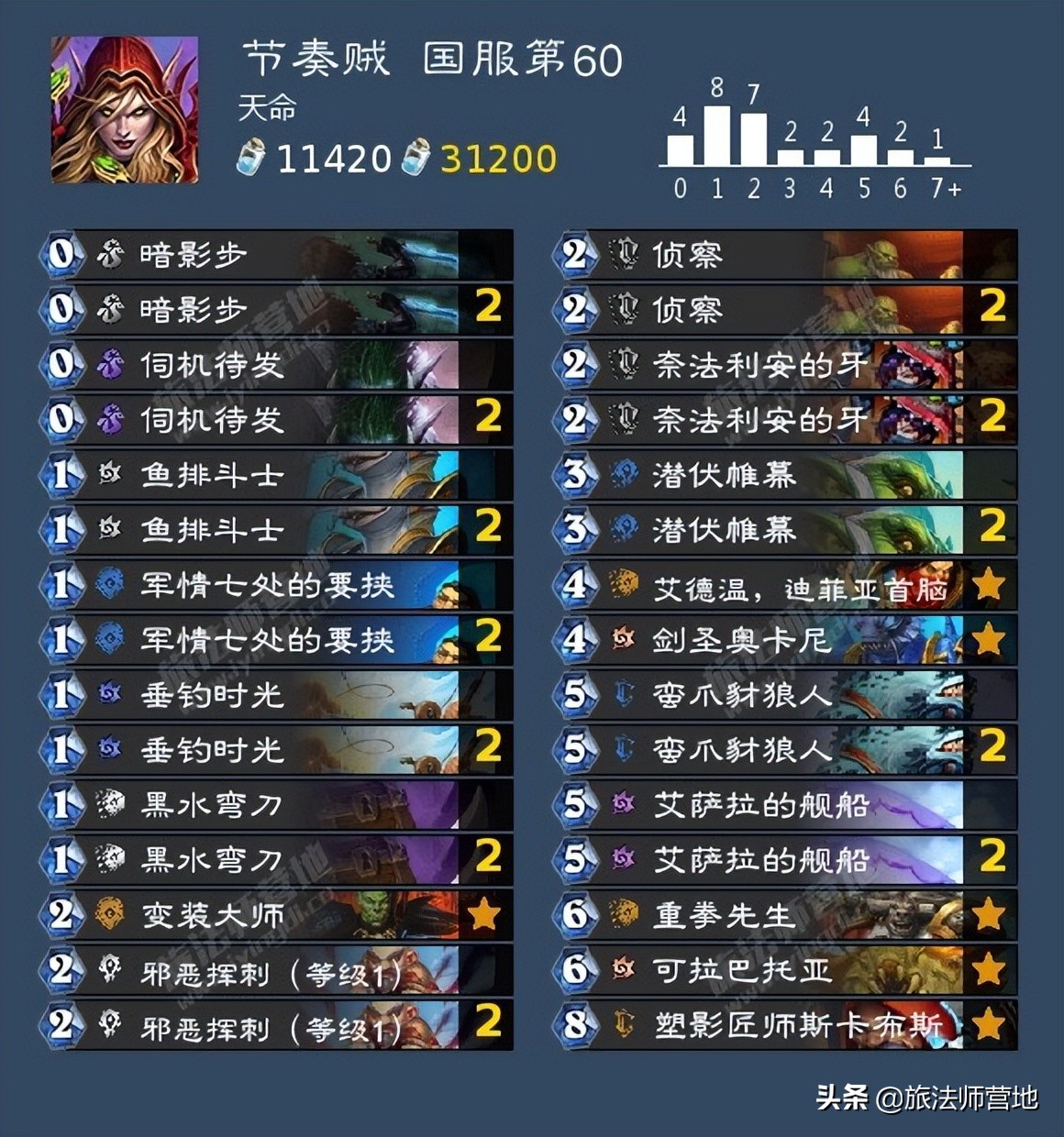 目前节奏贼的29张牌已经基本确定,第30张牌的竞争者按照热度排序是剑圣奥卡尼、锈烂蝰蛇、梵妮莎·范克里夫以及一些法术牌。剑圣奥卡尼是一个很不错的节奏卡,尤其是对上战士、法师时,往往可以直接摧毁对手节奏;锈烂蝰蛇的可交易词条可以在前期给蛮爪豺狼人减费,也可以润滑卡组,而且可以针对到战士和瞎子;梵妮莎·范克里夫胜在出其不意,而且与前两者相比是职业卡,在前期抽上来可以给豺狼人减费,但是很多时候就算对面忘了防小范也不一定能偷到什么好东西;带其他法术牌的目的是降低潜伏帷幕抽不到豺狼人的概率,而且和剑圣奥卡尼、锈烂蝰蛇相比也是职业卡,可以给豺狼人减费,但是问题在于现在除了节奏贼本来就会携带的9类法术以外,别的法术都质量堪忧。因此在邪能瞎热度略有退潮的现在,在先手打天梯时我会建议大家带上剑圣奥卡尼;如果你所在的环境中还是有一些邪能瞎,可以携带锈烂蝰蛇;如果你所在环境中内战特别多,可以考虑带小范惩罚对手。至于法术……个人不推荐携带。