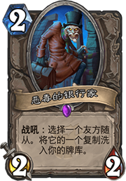可以看到我是满编了这张卡的,在某些对局,比如说与叠甲哥或者其他不太容易被压血线的职业对战,我们一发元气弹是无法击败对手的,如果只携带了一张银行家的话,很难有其他的获胜手段,我满编了银行家也正是因为我想有更多的取胜手段,两张银行家配合蛇发女妖能让我们通过打出天启四骑士获胜,实测效果不错,比较有趣的是,有一局对阵天启骑,我最后靠天启四骑士击败了对手。
