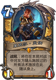 莱妮莎·炎伤:在这套牌中,炎伤的首要任务是过牌,其次是作为一道大墙站场。我满编了剑龙骑术,但大多数情况下我使用了一张剑龙骑术后便拍出炎伤。
