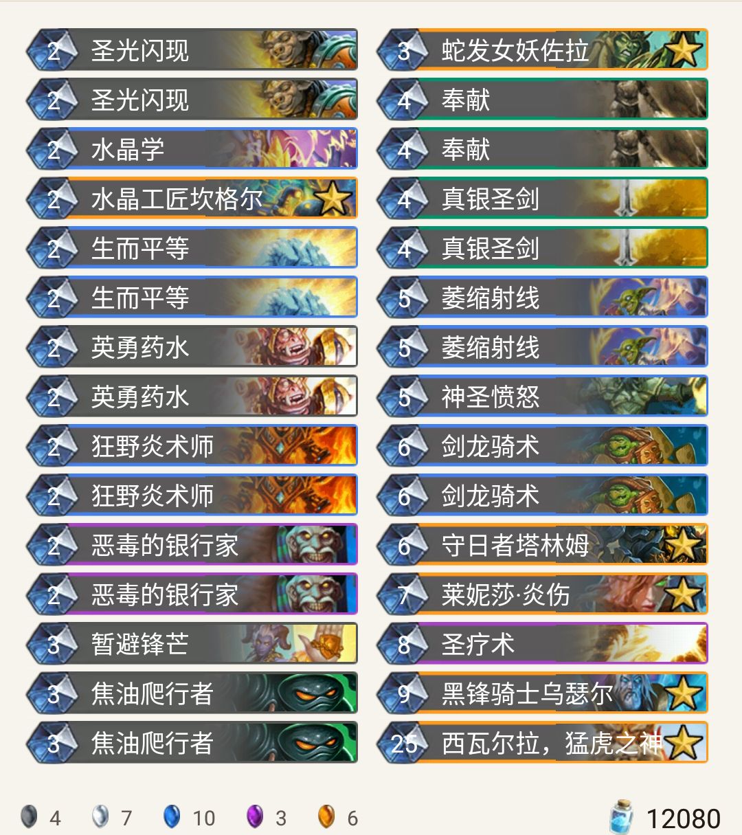 过牌组件:我携带了两张圣光闪现,两张英勇药水,一张水晶学和圣疗术,在极端的情况下,神圣愤怒可以作为一张愤怒之锤解场+过牌。