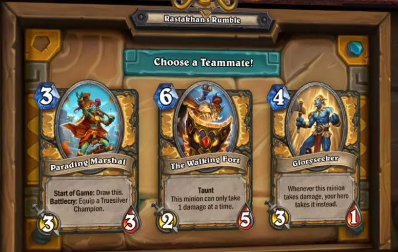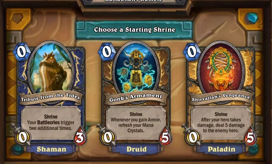 在每局对决结束后,你都可以三选一选择适合自己队伍的牌(包括随从、法术和战友)加入卡组,每个职业都有六张专属随从,也就是共有54名专属随从出现在冒险中。不少随从在之后的作战中可以和神龛打出神奇配合。