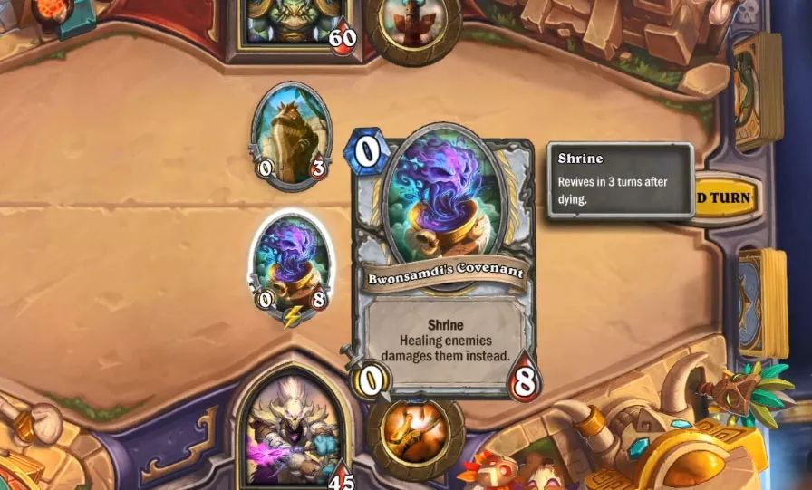 冒险开始前玩家要从随机的一组三座神龛中选择一座。它会在比赛开始时就出现在场上,当他们受到伤害后不会死亡,而是休眠,在休眠三个回合后,他们又会复活,为你继续提供被动效果。