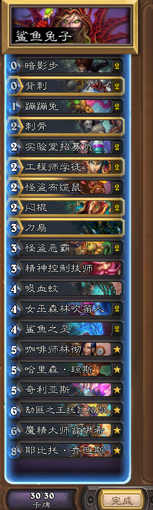 2、鲨鱼之灵尽量能利用2个回合时再下,常见的为后手时2费学徒暗影步,3费硬币鲨鱼0费学徒,这样之后一回合还能利用鲨鱼的效果