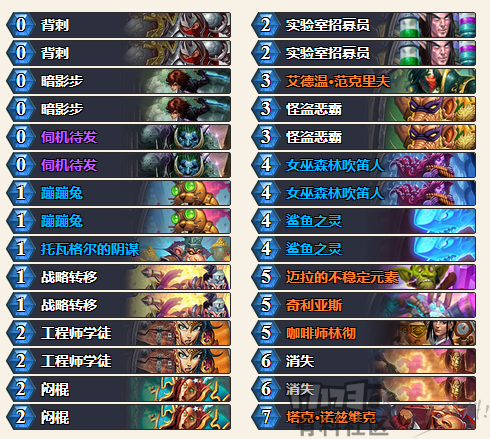 虽然导致的伺机待发和怪盗恶霸被削弱了,但是依然不会影响他们加入构筑,卡组核心就是过牌加兔兔(以及兔兔的繁衍),由于兔兔的费用很低,所以消失非常适合这套卡组,在消失回合可以,再上场兔兔,这就保证了在消失回合能够完成解场,返场,卡组类似任务贼,并且卡组中也加入了。迈拉·不稳定的元素,如果手中有兔兔和洗牌的时候,可以净化牌库,保证每回合一个兔兔,又可以达到青玉德的效果,总之卡组非常灵活,构筑完整。