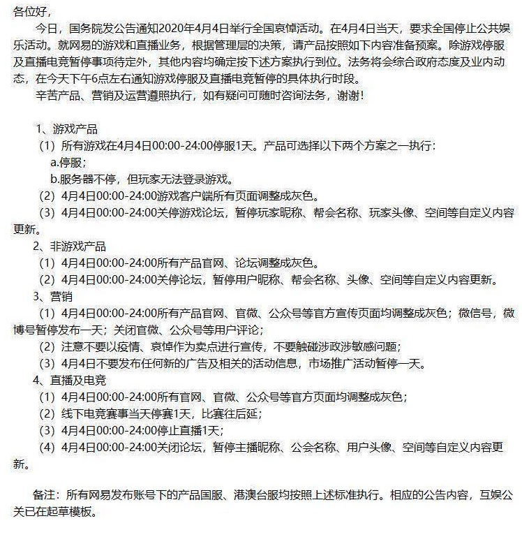 因为4月4日是全国哀悼日,根据政策全国将停止公共娱乐活动,而玩家关心的部分手游也将面临停服的情况,目前优先公开的是网易旗下的游戏,这里带来具体的说明。