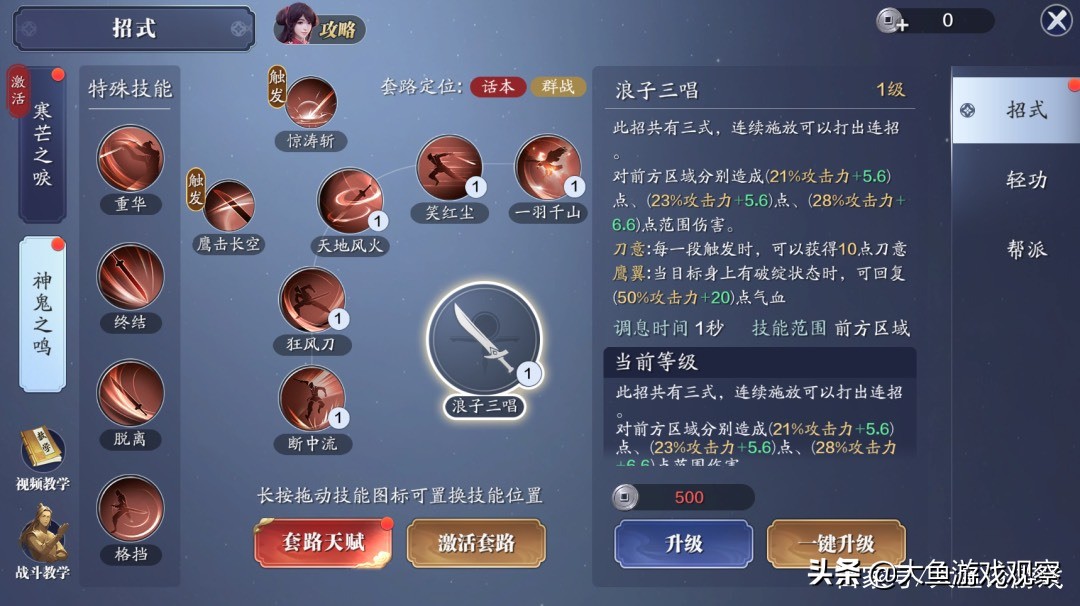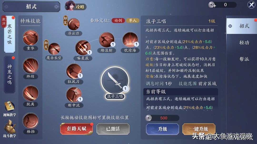 其中基础刀意,神刀在战斗中使用“浪子三唱”、“鹰击长空”时,可积攒刀意。“断中流”、“狂风刀”则需要消耗刀意使用。