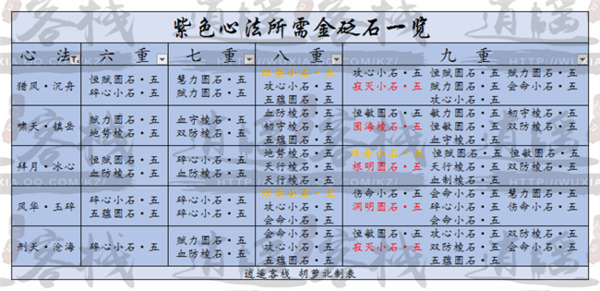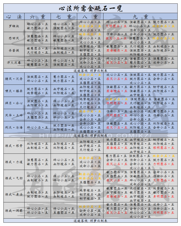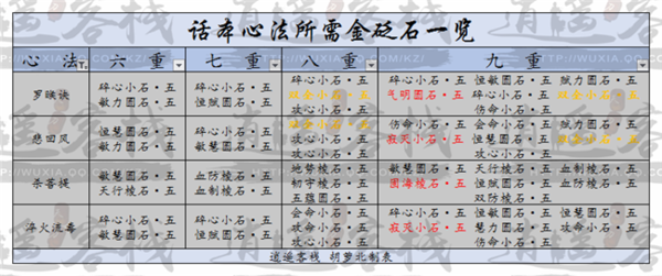 心法是天刀角色属性的一个重要来源,心法的选择很大部分上影响了角色的流派走向,或肉或核,很多时候一看心法配置便能明了,今天我们一起来分析各种心法满重所需砭石。