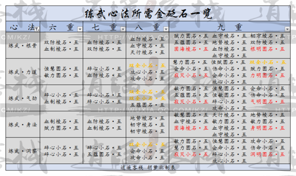 最后附上全部心法所需金色砭石一览表,四本心法还未定型或者打算改变角色属性侧重的小可爱可以参考一下,如果所获唯一砭石中有心法用不上的,小可爱们也可以塞在经脉里面。例如萝北作为一个邪教香的心法是《炼武·气劲》、《炼武·力道》、《风华·玉碎》和《罗睺诀》,萝北的心法突破不需要固海棱石·五,萝北则是把固海塞在了经脉里。最后友情提示各位小可爱,如果心法已经不需要五明了,经脉里面也是五个五明圆石都可以各自塞一颗的。