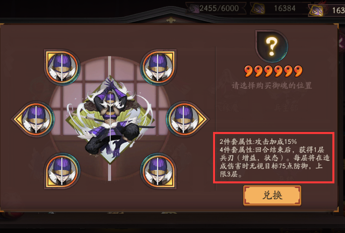 这套体系中,辅助式神的御魂选择没什么变化,用她们的老一套即可,至于茶几,目前最高上限的御魂是兵主部+土蜘蛛。选择兵主部的理由很简单,面对长线副本时(一波完全打不掉),怪物的防御力会很高,而茶几三技能第一形态【侵略】可以无视敌人部分防御力、增伤效果还需要暖机,完美契合兵主部3个回合后附加无视防御的效果。