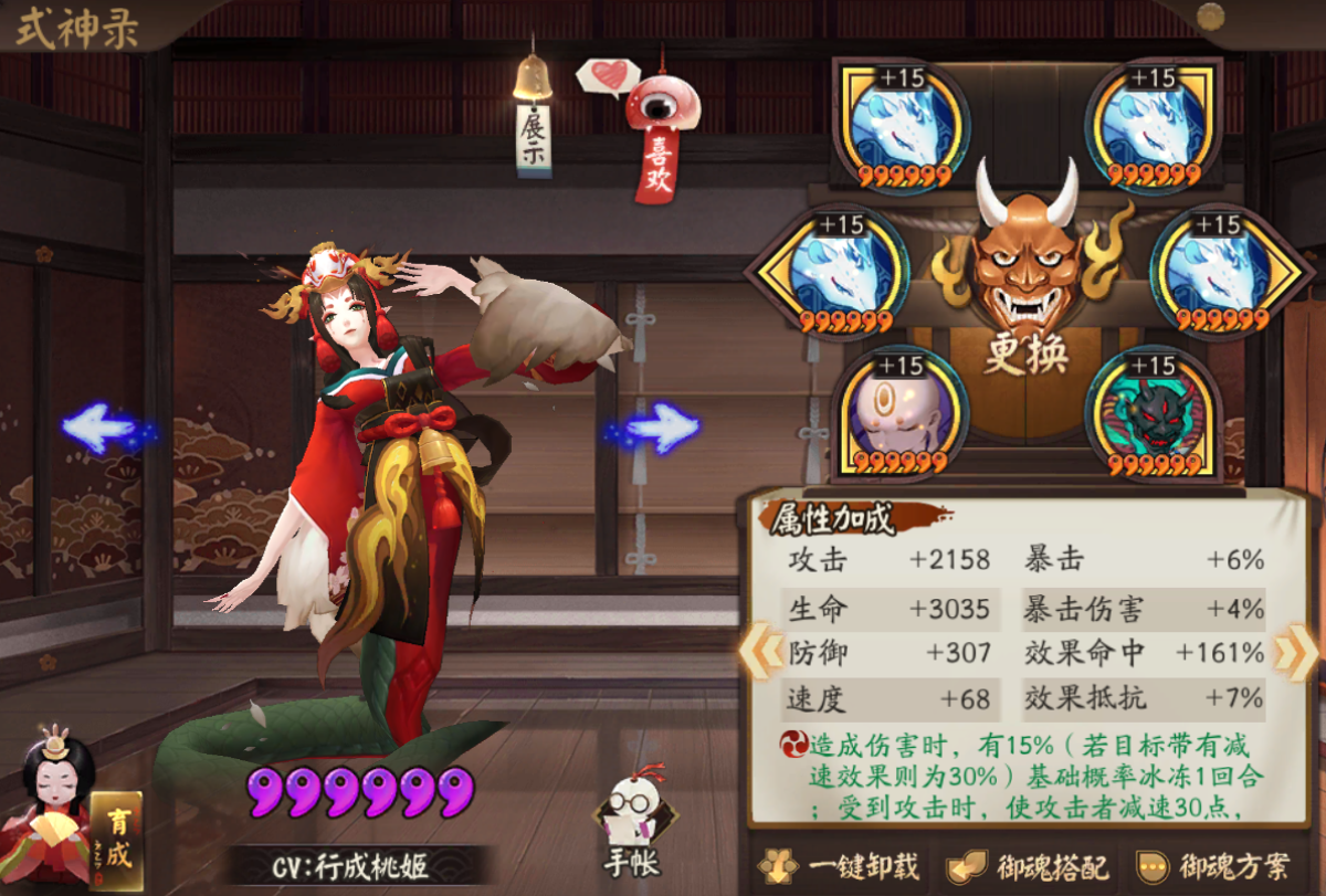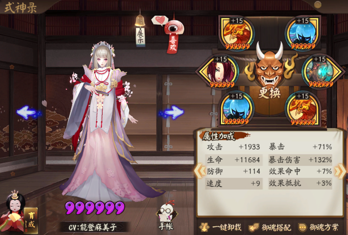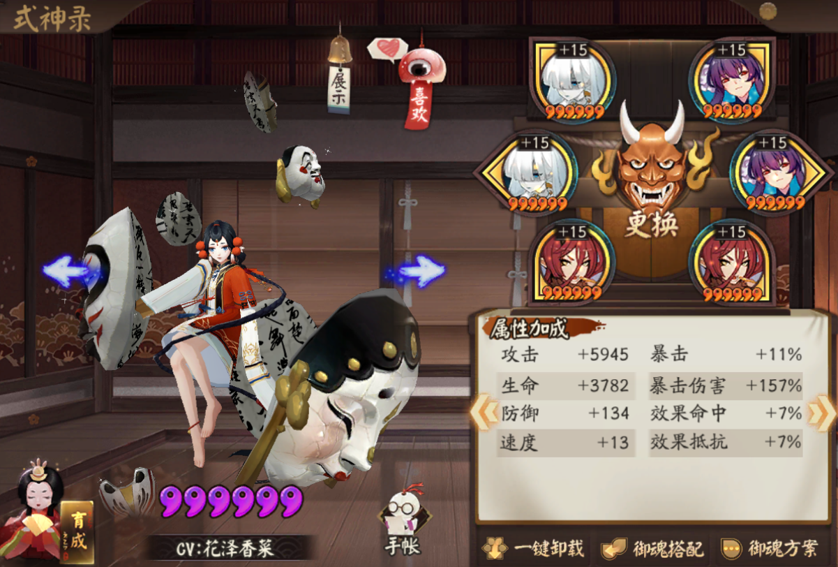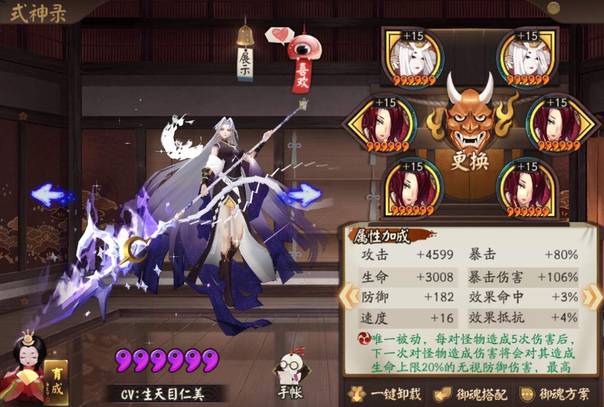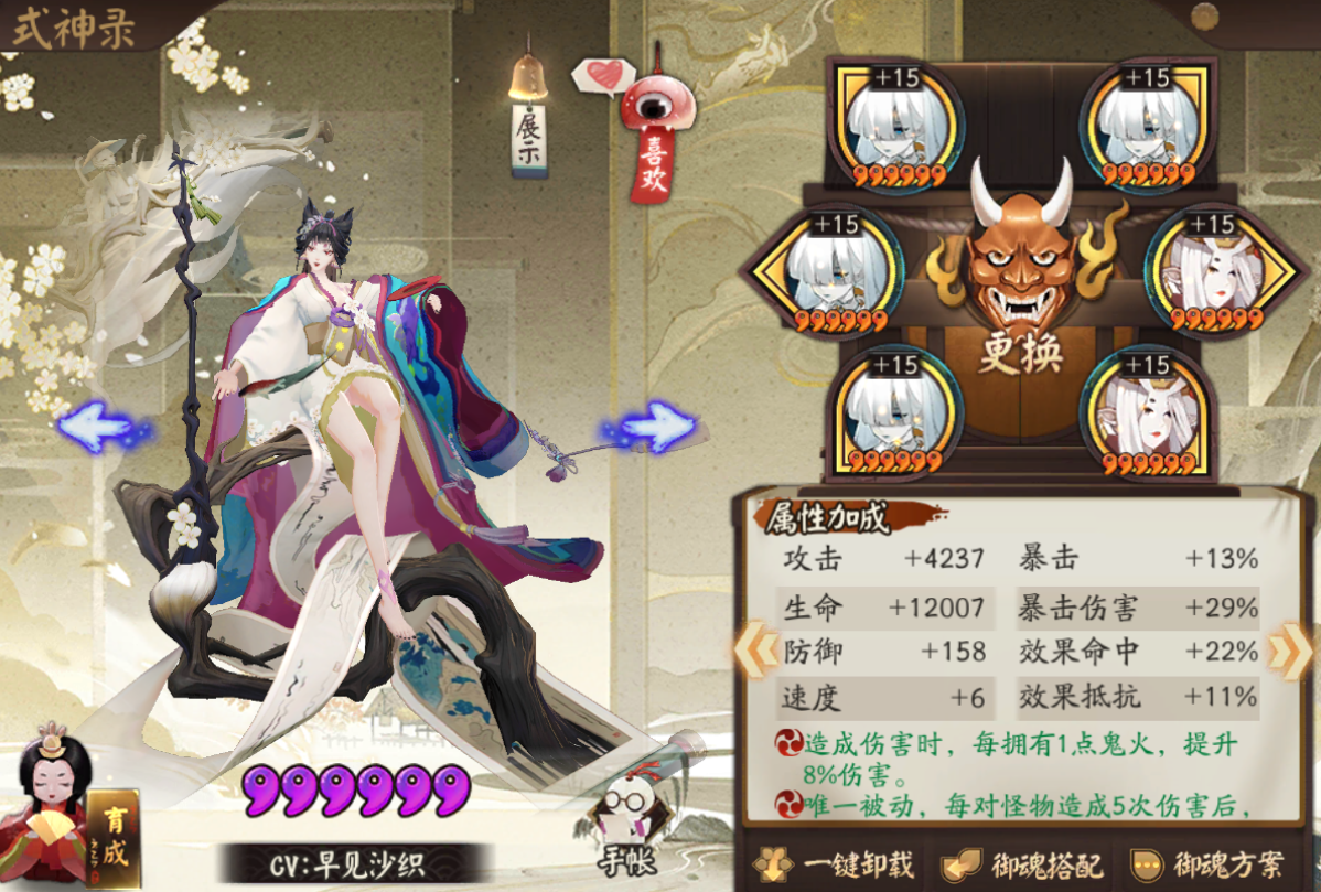清姬、追月神与丑女的御魂不用变,分别用雪幽魂、火灵、狂骨。而两位输出式神也很简单,首先两面佛需要痒痒鼠们把账号内最棒的针女+鬼灵歌姬为他穿上;反观面灵气则要随意很多,因为军衔BUFF有鬼火减少这一增益,我们可以直接用散件爆伤套。