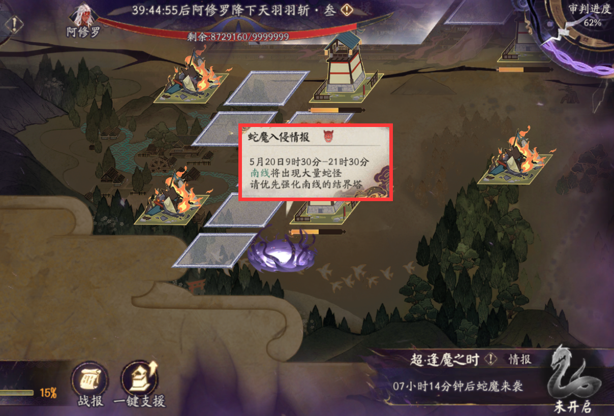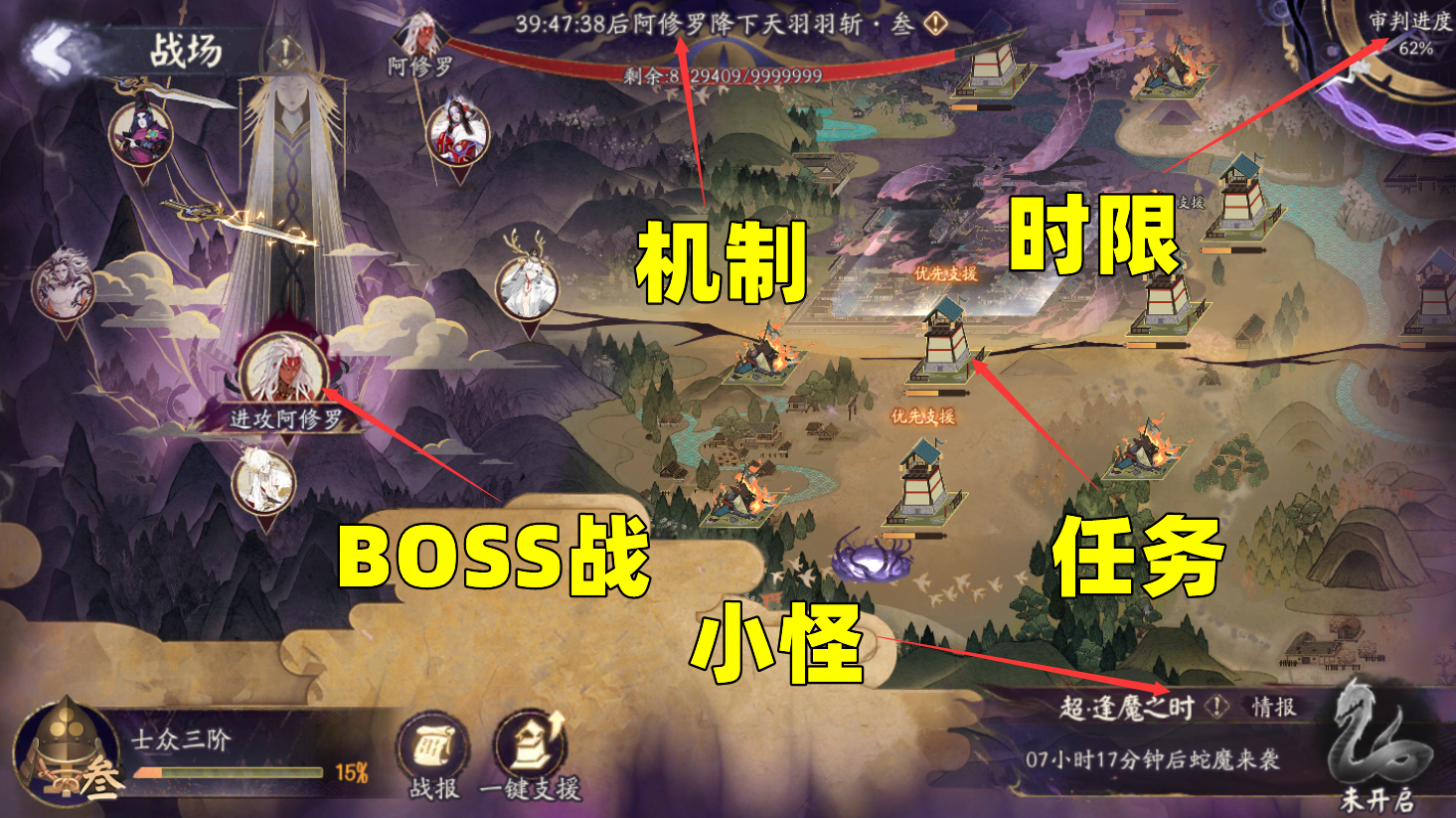 上图右上角的审判速度就是时限,当进度达到100%后,我们将无条件进入战败结局。进度会随着时间而增涨,一个小时涨幅0.25%。除此之外,每48小时会降下一次天羽羽斩,进度会一次性上涨10%。换句话说,【邪神降临】的玩法需要一边阻止进度达到100%、一边想办法解决阿修罗。