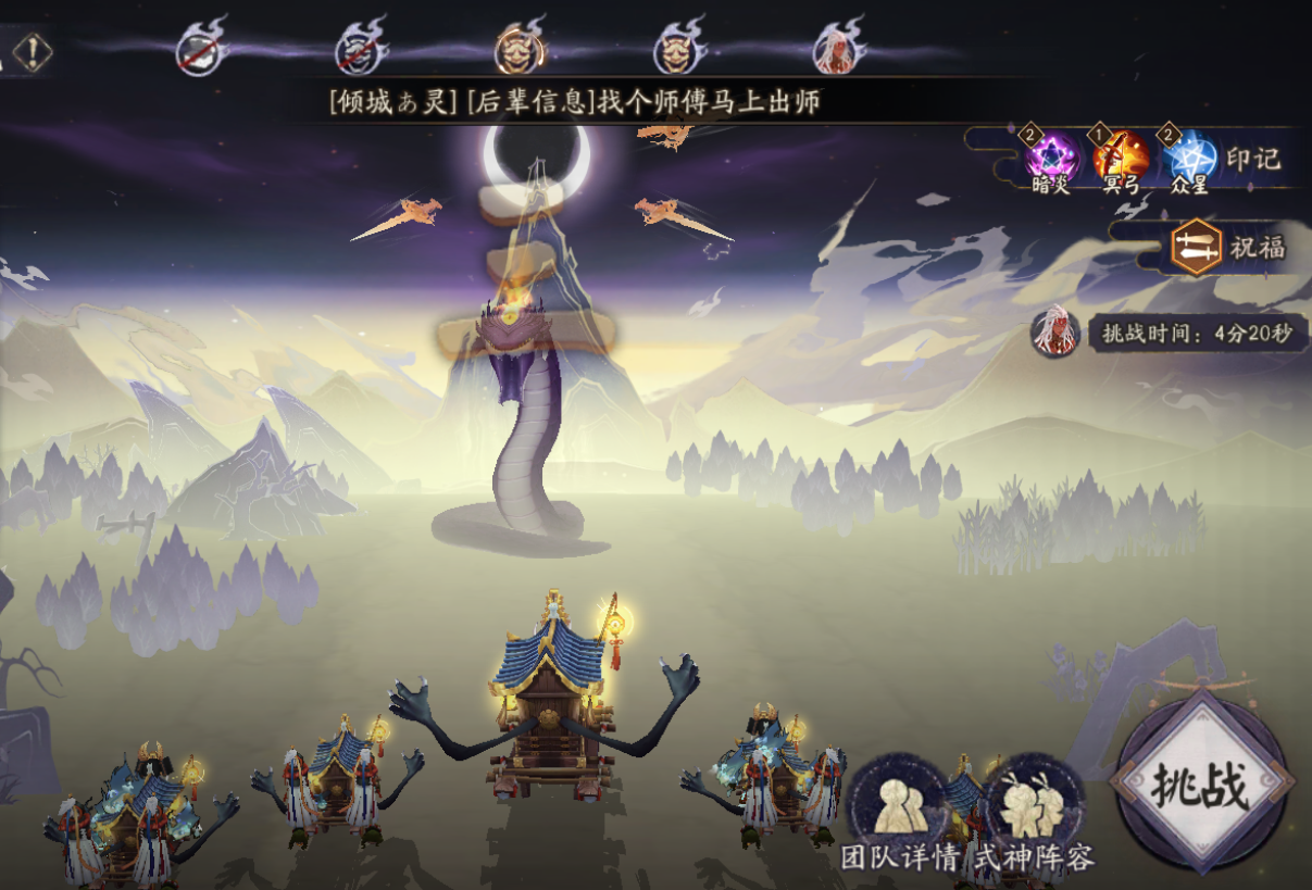 大家如果有条件的话,尽量寻找亲友or寮友一起组队,毕竟选择BUFF关系着我们最终打出的伤害,如果路人乱选的话会很难受......按照体验服的测试来看,【冥弓】【众星】是很棒的印记,只有【胧车】比较尴尬,毕竟胧车会占据千姬的召唤物单位。