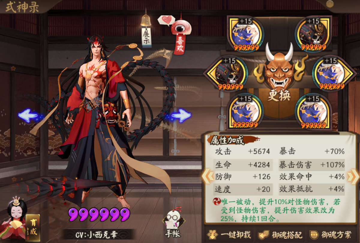 最后聊一聊需要注意的细节。上文提到过战斗会继承爬塔的军衔增益,所以痒痒鼠们搭配御魂时,只要将暴击堆到80%即可。而阿修罗会以类似于分身的形象出现在我们面前,在5分钟的BOSS战中大家可以击败好多次,每次会掉落一个灵神体碎片,获得999999枚碎片才可以彻底击败阿修罗,开启与SP大蛇的决战。
