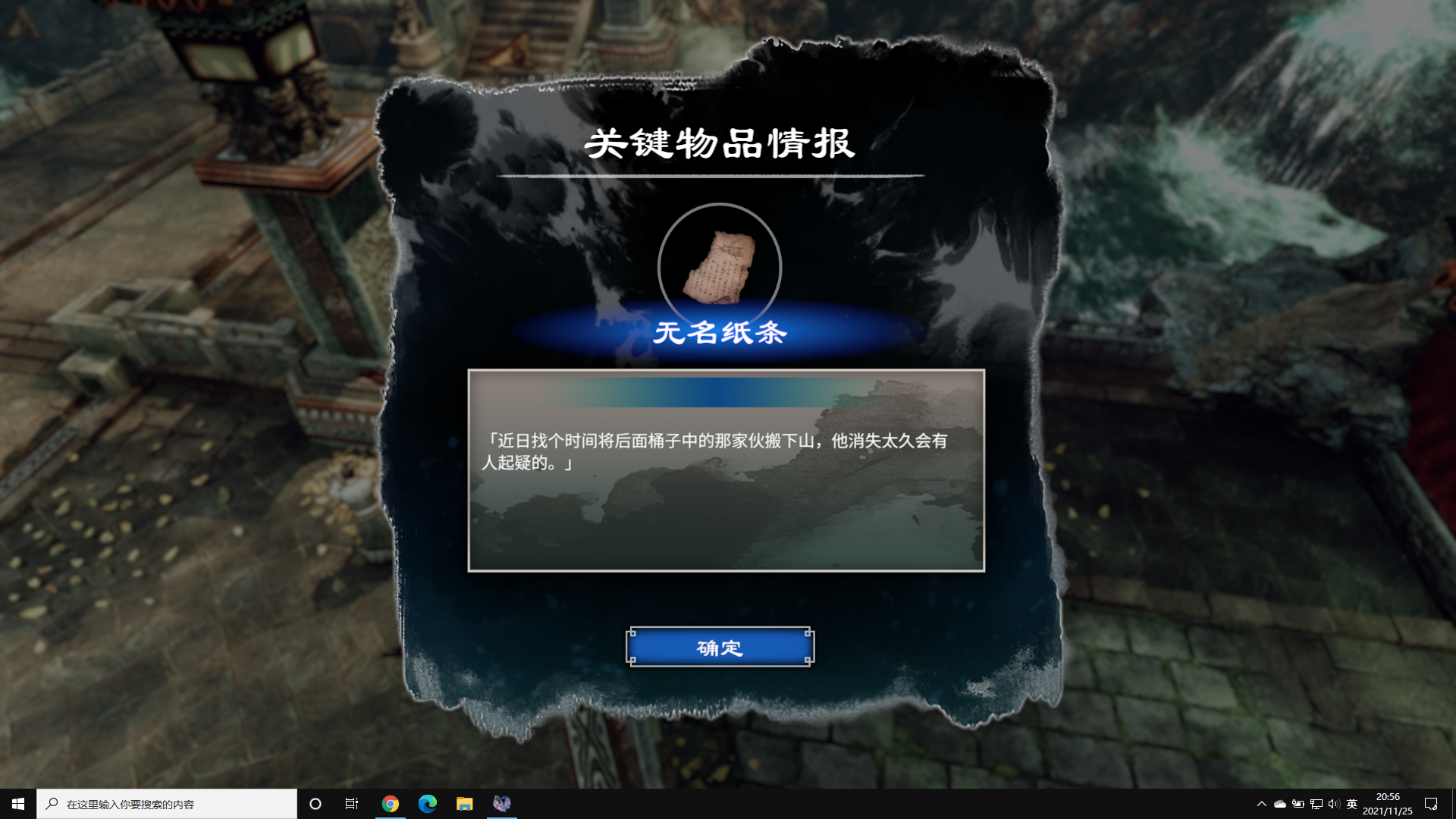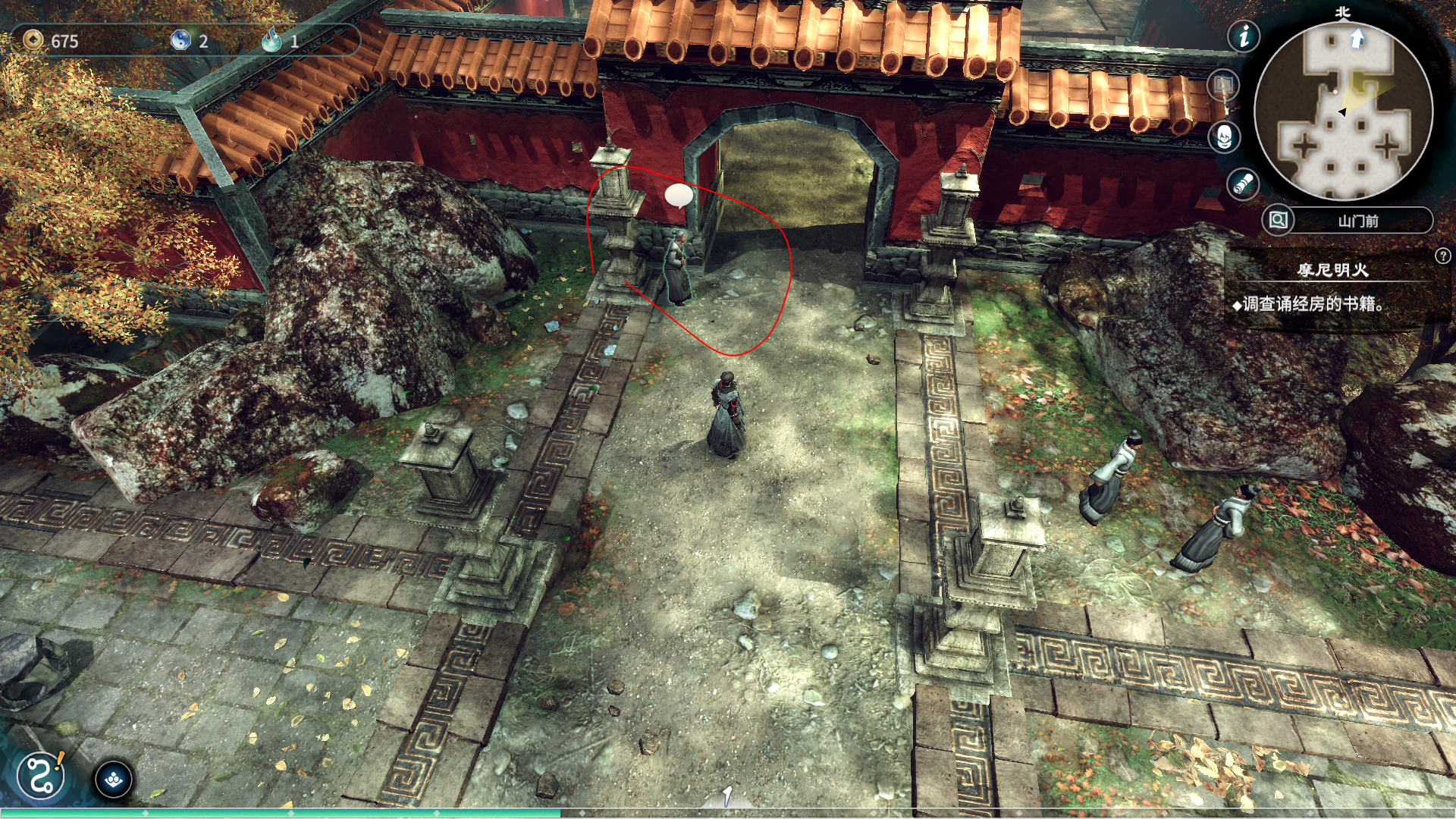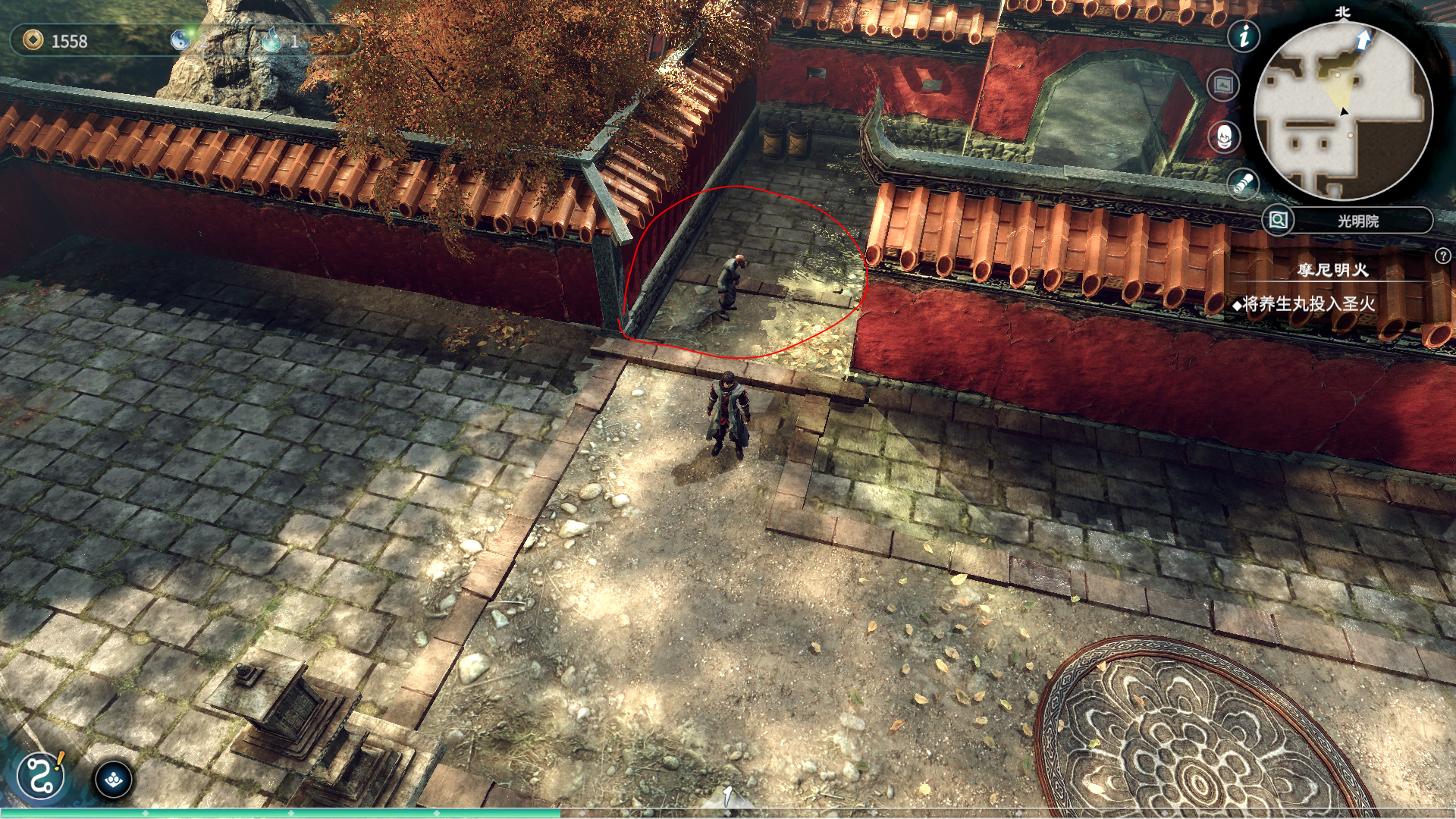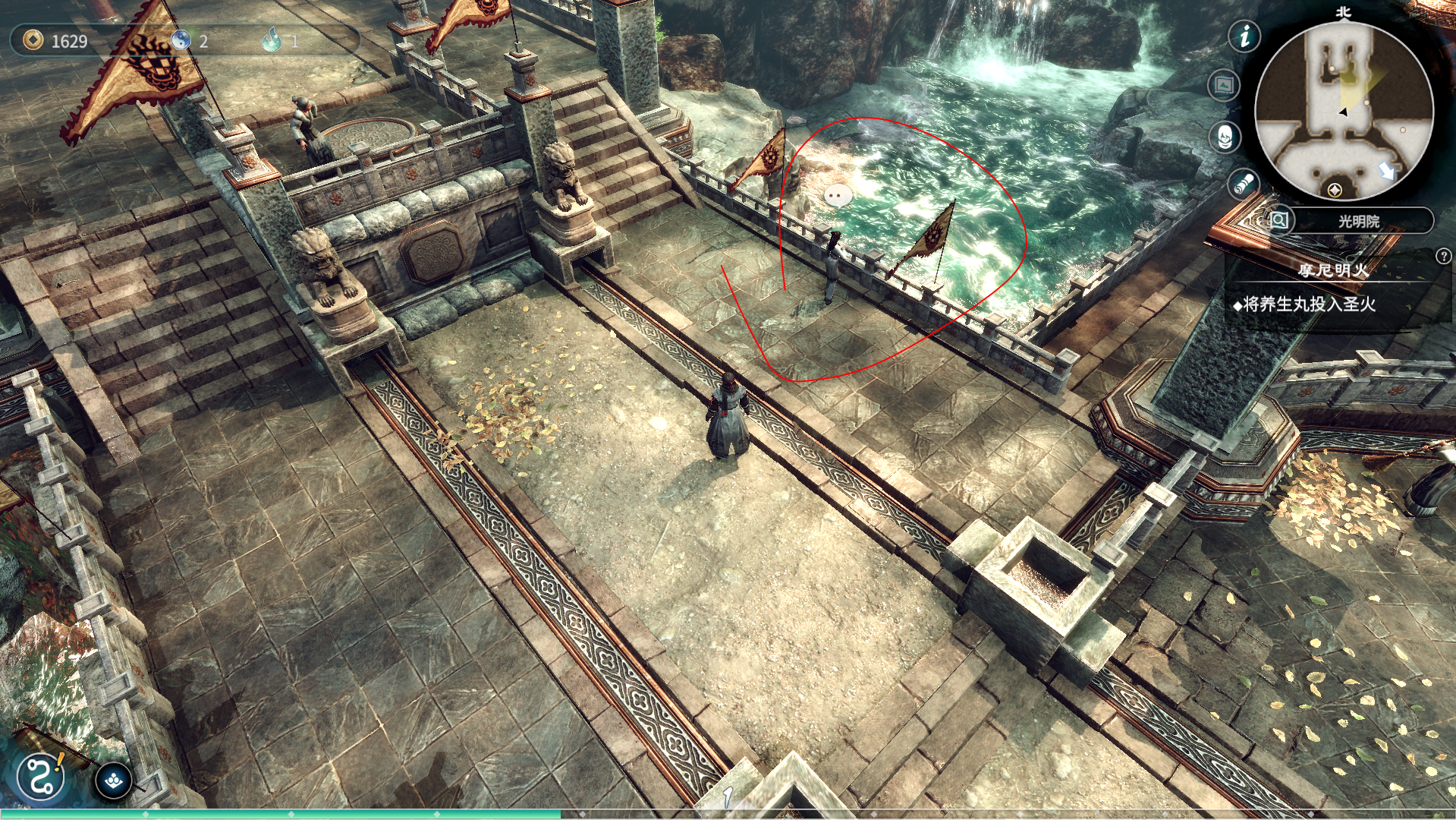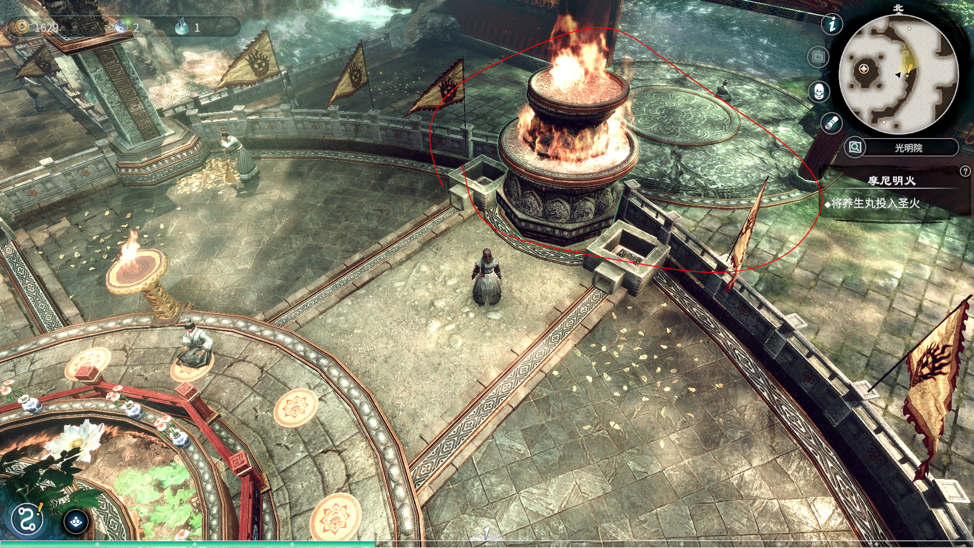 接下来出诵经房,来到光明神像这里完成主线,将养生丸投入圣火中完成主线。接着去面向山门的右手边,右手边瀑布处站着两个男的信徒。对可以对话那个信徒出示买金纸的便签,他将会给你钱。