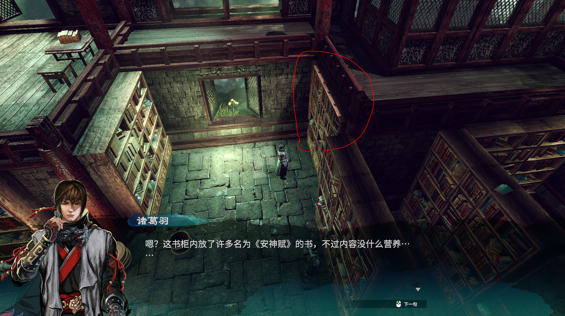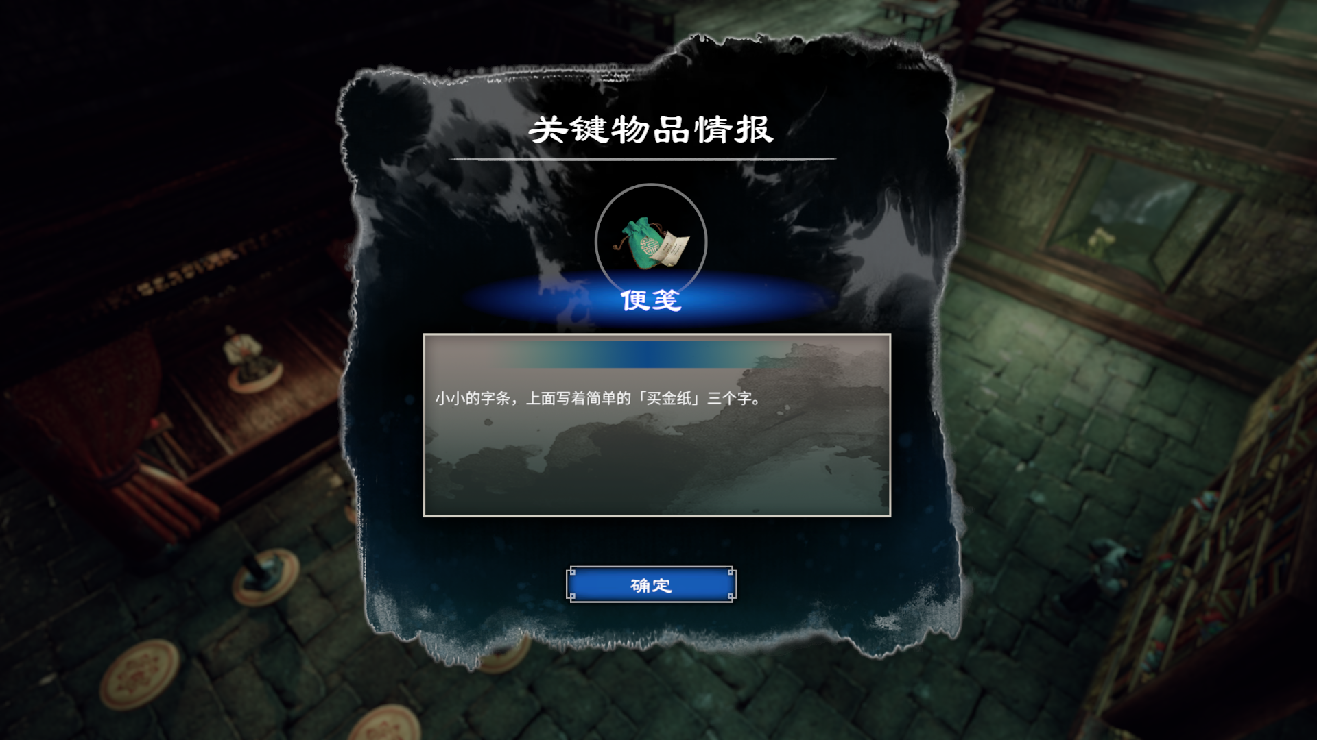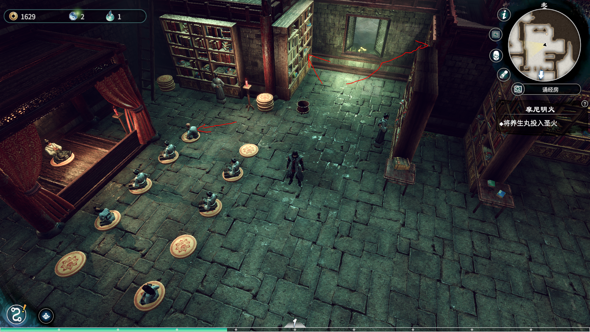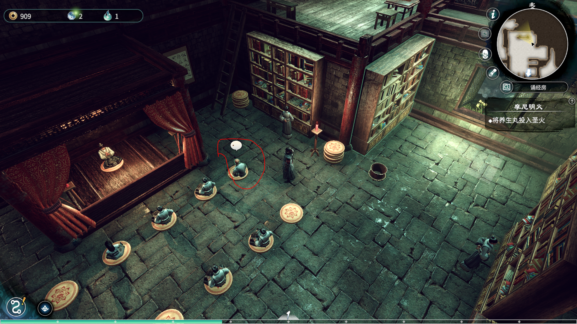 完成上一个任务后,进入诵经房,诵经房是主线任务。诵经房的书架上将会获取名为《安神赋》的书籍和完成主线的剧情。将安神赋书给那个打坐但是心神不宁的老爷爷,他看完后将会睡着,接着你对他出示养生丸,他将会醒来。你将会获取一个买金纸的便签,记得完成主线任务哦。