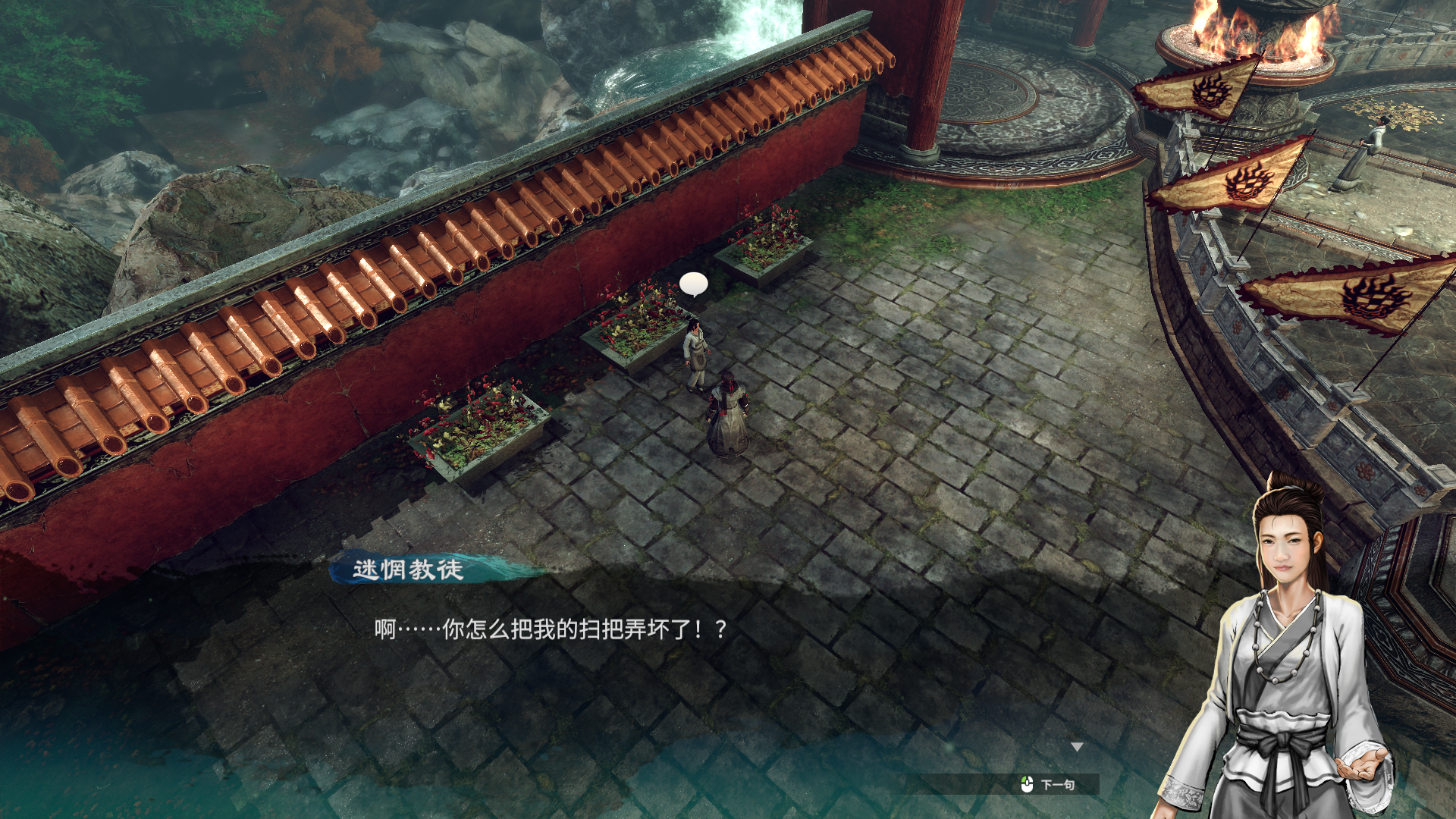 上一个做完后,接着向卖水商人的左手边走去,那里站着一个拿着扫把的女教徒,她其实想偷懒,不想扫地。所以你对着她使用破坏,你会把她的扫把弄坏,她就可以正大光明地偷懒了,她会给你药