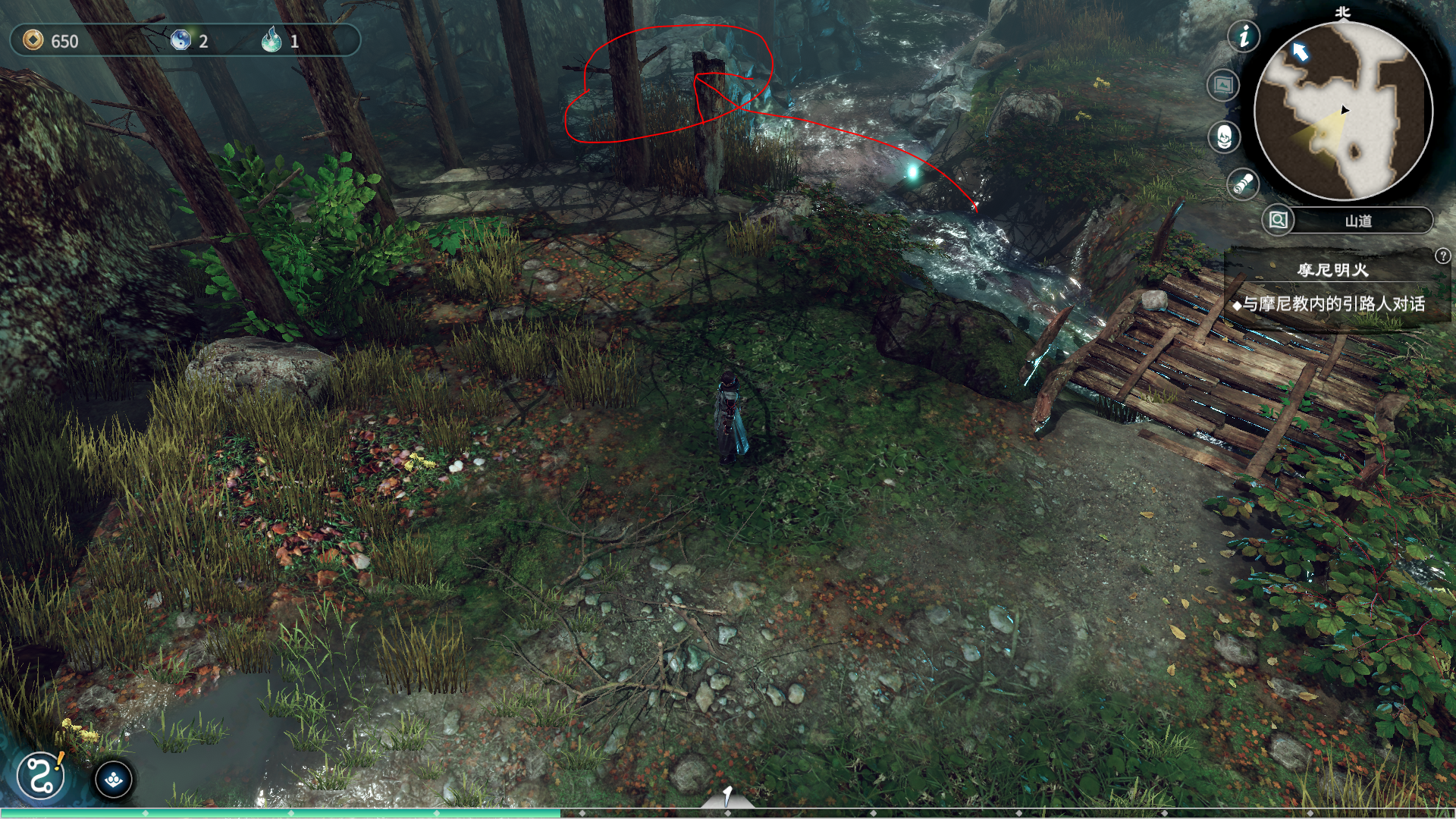 游戏开始,会在一个山道上,山道这里我目前只发现有两尾鱼的收集,鱼目前可以用来喂宠物,它会给你物品。