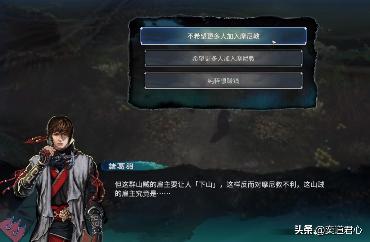 乌合之众怎么可能敌得过主角光环,经过一番砍瓜切菜的战斗,诸葛羽打倒了山贼老大,并从其口中推测雇佣山贼的雇主并不希望更多人加入摩尼教。随着山贼老大的进一步交待,雇主的母亲正是深受摩尼教所害,印证了诸葛羽判断的合理性。山贼老大还把上次与雇主碰面时,捡到的从对方身上掉落的平安符交给了诸葛羽。坦白从宽,诸葛羽念在这些山贼只是受雇驱赶来客,并没有实质抢劫钱财和伤人害命,便放他们离去了。他还嘱咐山贼老大转告雇主,摩尼教的事情已经有官差处置,让他不要再雇佣社会闲散人员了。