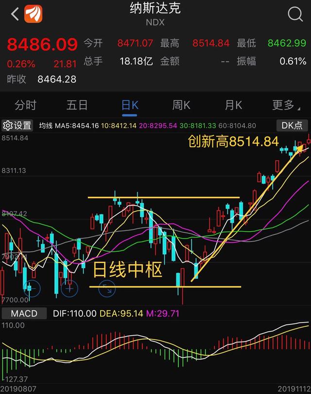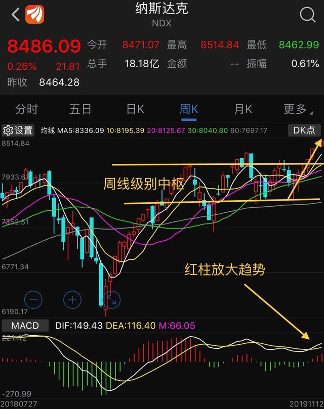 美国纳斯达克指数,不断创出历史新高,昨晚到达8514.84点,突破日线级别中枢,后市可期。周线级别上来看,也是一样,走势突破周线级别中枢,在MACD上来看红柱有放大趋势,预计会有一波像样的行情。