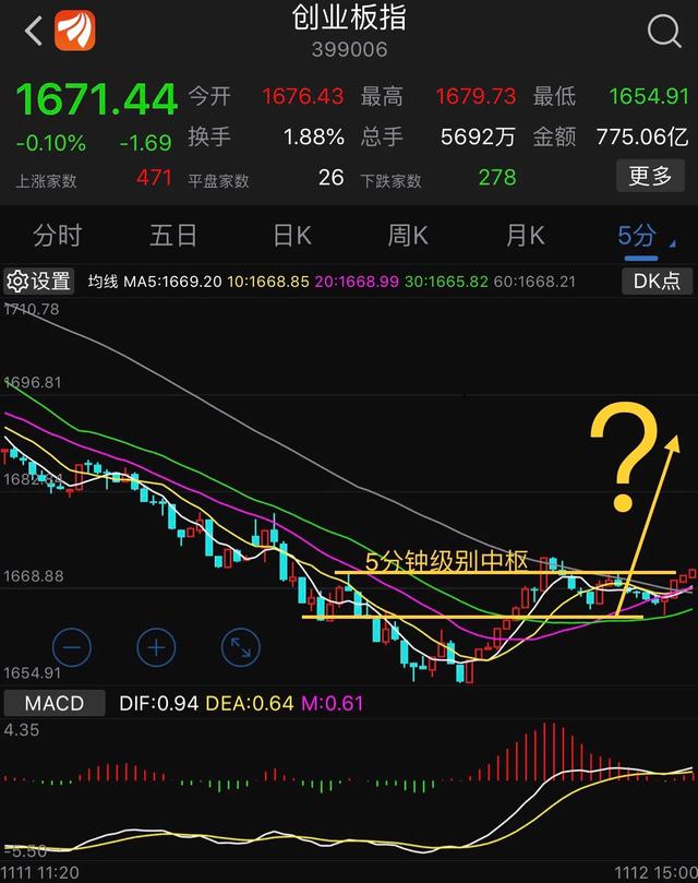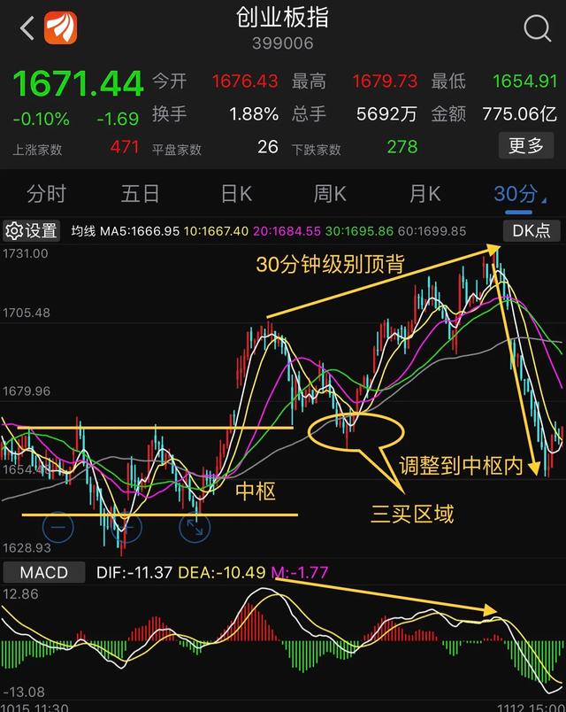 我们的创业板指将如何演变?30分钟级别,在上周形成了一个三买区域,在上周五11月8号,走到30分钟级别顶背的位置,1731点。开始调整,这波调整幅度较大,直接踩破三买区域来到前面的一个30分钟中枢内部。很多朋友都在担心今天开盘是否会继续下跌呢?现在来看在5分钟级别里,在制造一个中枢。现在需要等待的是,这个5分钟级别的中枢突破。会不会反弹决定于60日线的支撑。