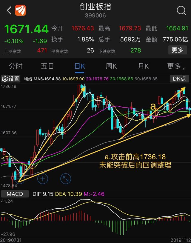 那么从创业板指日线级别来看,a段是第1次进攻,前面高点1736.18点。目前是整理,目标和任务是第2次攻击1736.18点。这里的支撑位置正好是60日线。一旦这里站稳,就要去攻击前高。