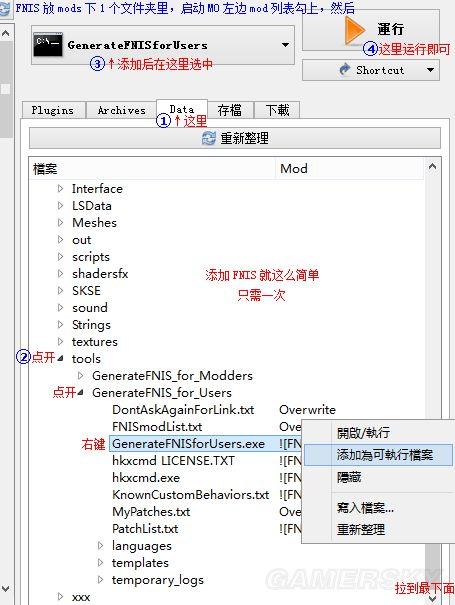 ③D:GameSkyrimdata-----------数据。(MO只读取。MO启动的FNIS等工具想往里产生文件都由MO接收)